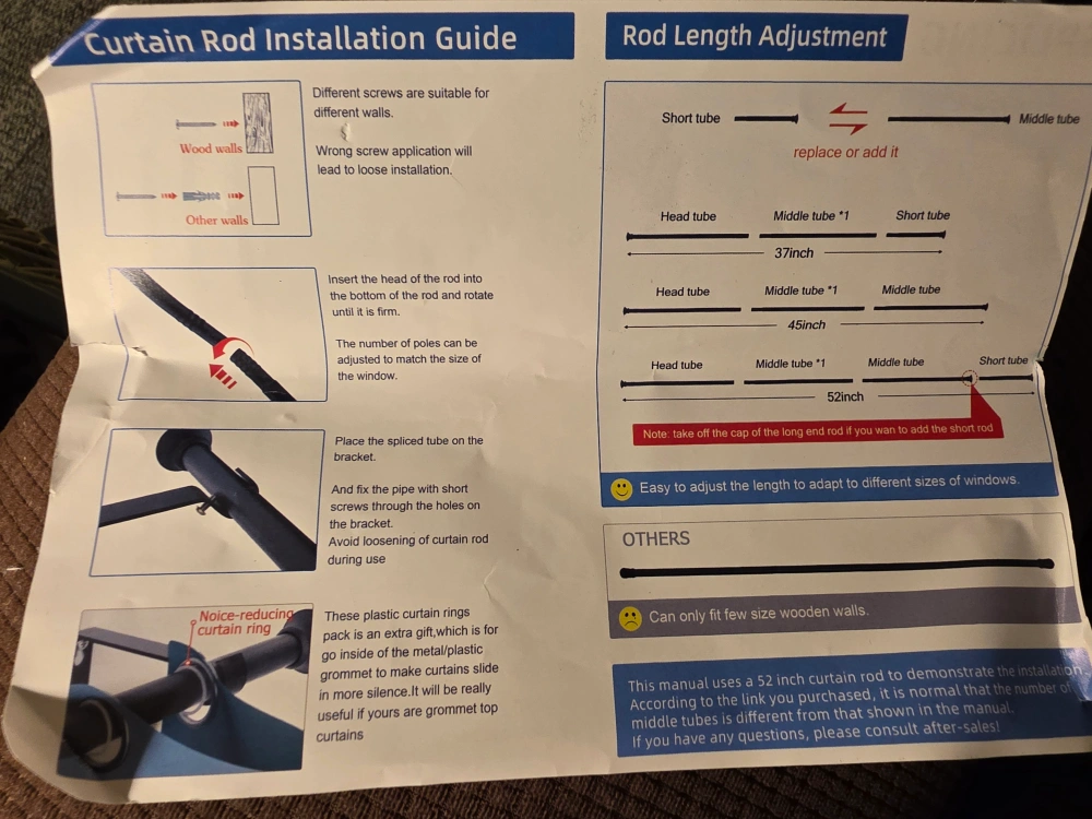 Includes an installation guide. The rod is for the size of windows. There is a noise-reducing curtain ring. Using this item can make your room feel more cozy.