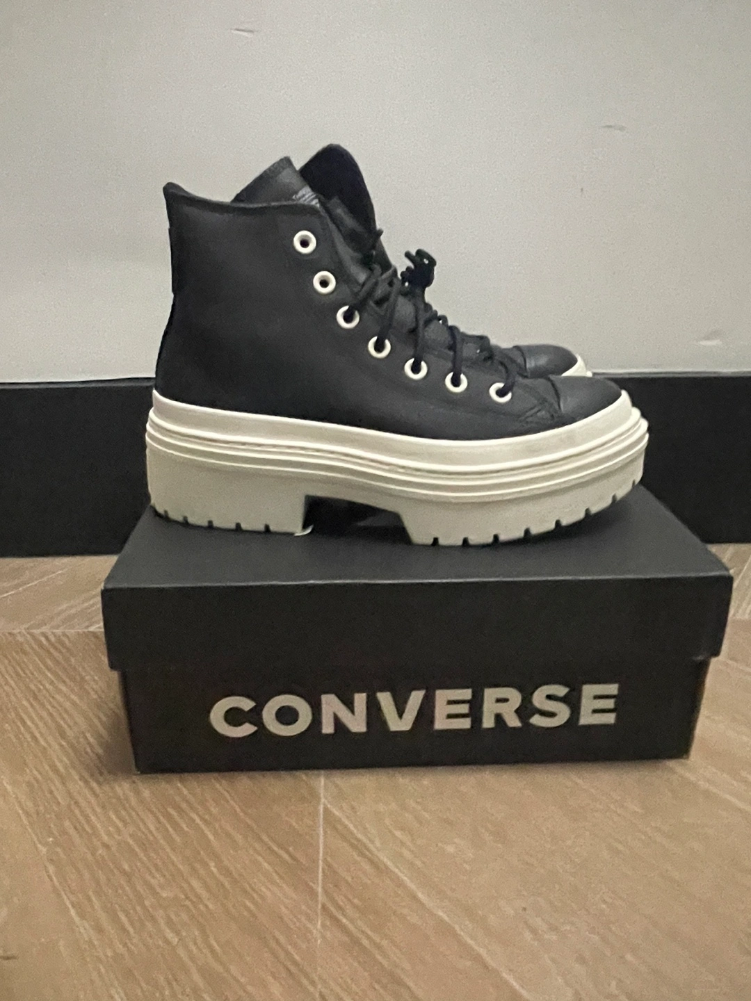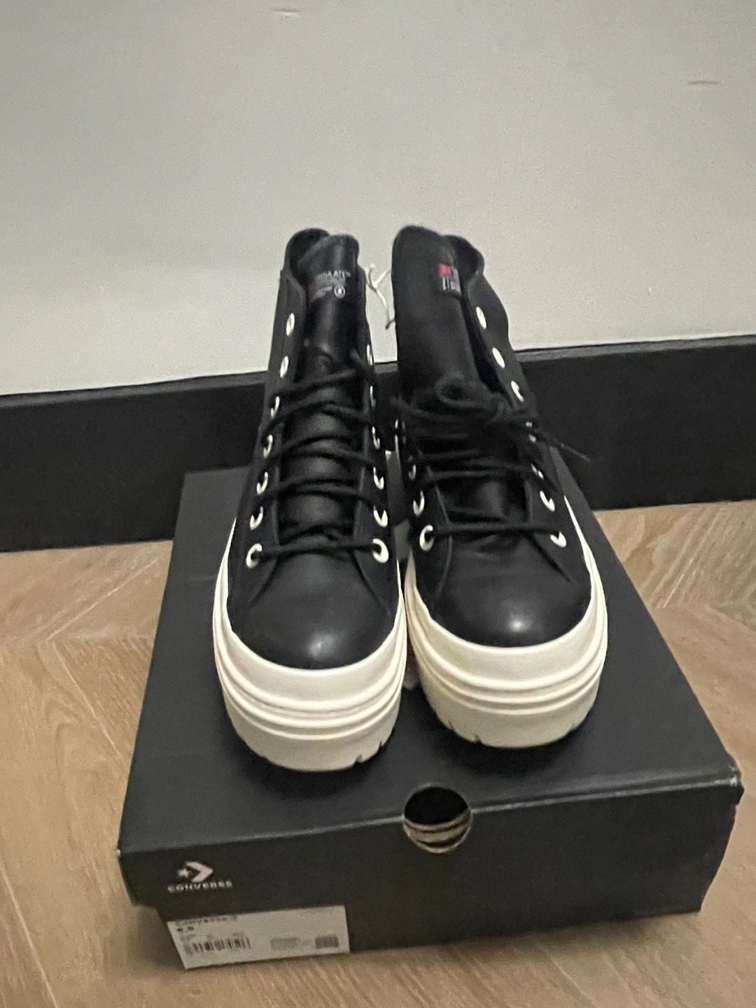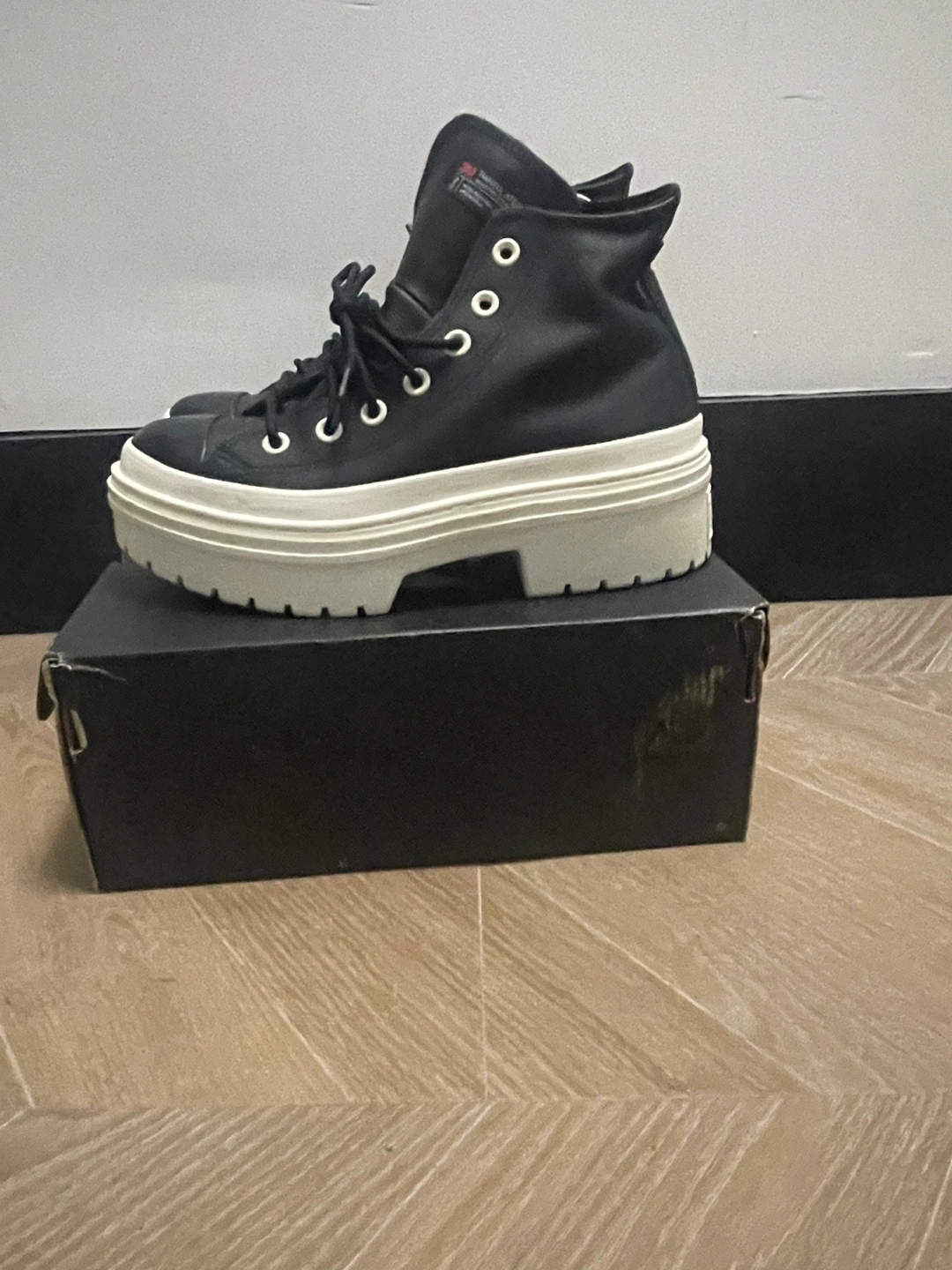 Durable leather upper. OrthoLite® cushioning insole helps provide optimal comfort. Iconic Chuck Taylor ankle patch and All Star license plate. Platform with block heel. Round toe design. Imported. Product measurements were taken using size 9, width B - Medium. Measurements: Heel Height: 2 in Platform Height: 1 1⁄2 in These were new in box but now they have scratches in the top part on the sneakers by the toes area. Zoom into photo 2 or ask for more pics. Not really noticeable but a flaw. Bottoms are in pristine condition because they haven’t been worn. Pick up Comes with original box