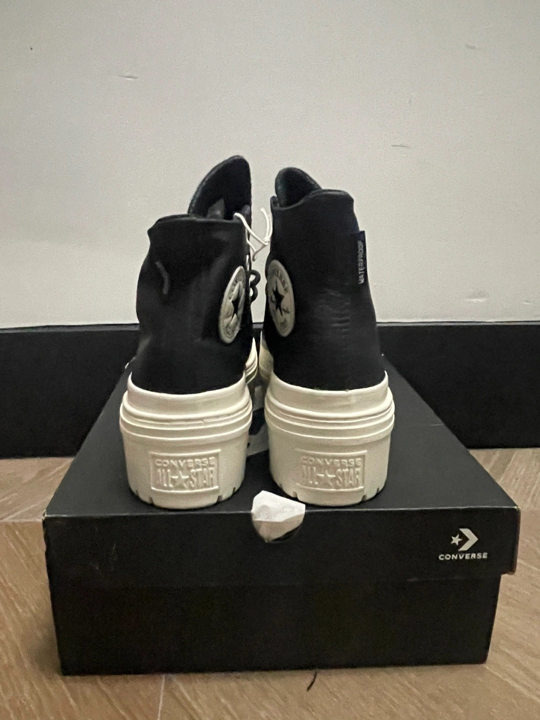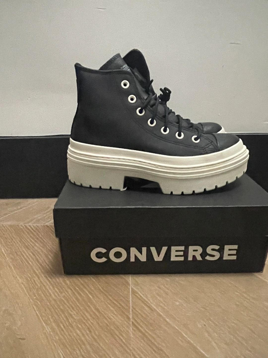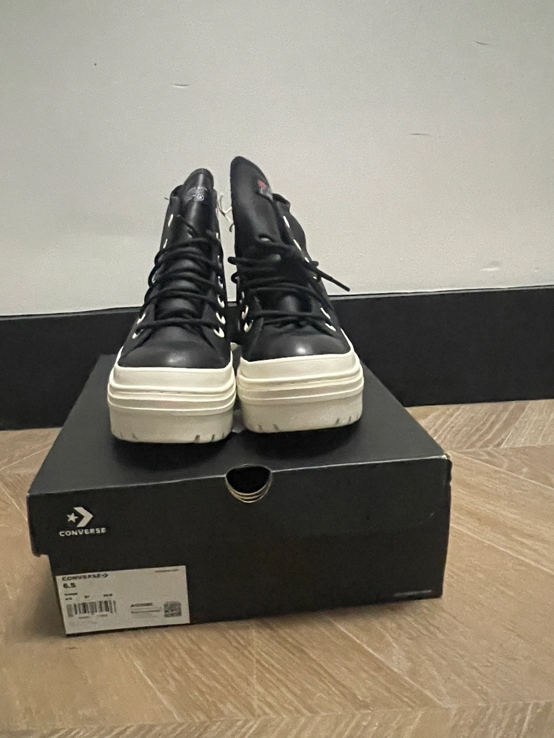 Durable leather upper. OrthoLite® cushioning insole helps provide optimal comfort. Iconic Chuck Taylor ankle patch and All Star license plate. Platform with block heel. Round toe design. Imported. Product measurements were taken using size 9, width B - Medium. Measurements: Heel Height: 2 in Platform Height: 1 1⁄2 in These were new in box but now they have scratches in the top part on the sneakers by the toes area. Zoom into photo 2 or ask for more pics. Not really noticeable but a flaw. Bottoms are in pristine condition because they haven’t been worn. Pick up Comes with original box