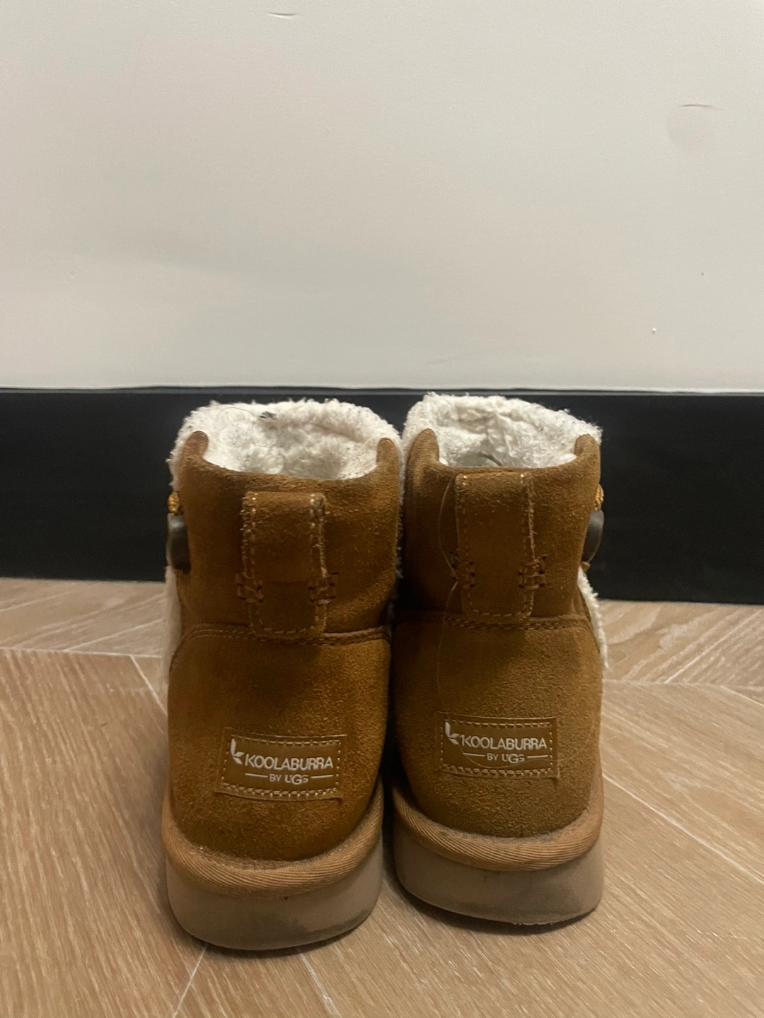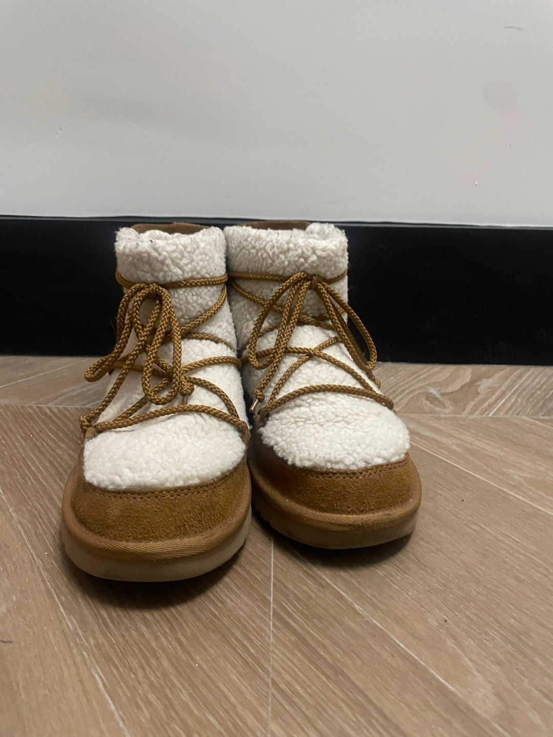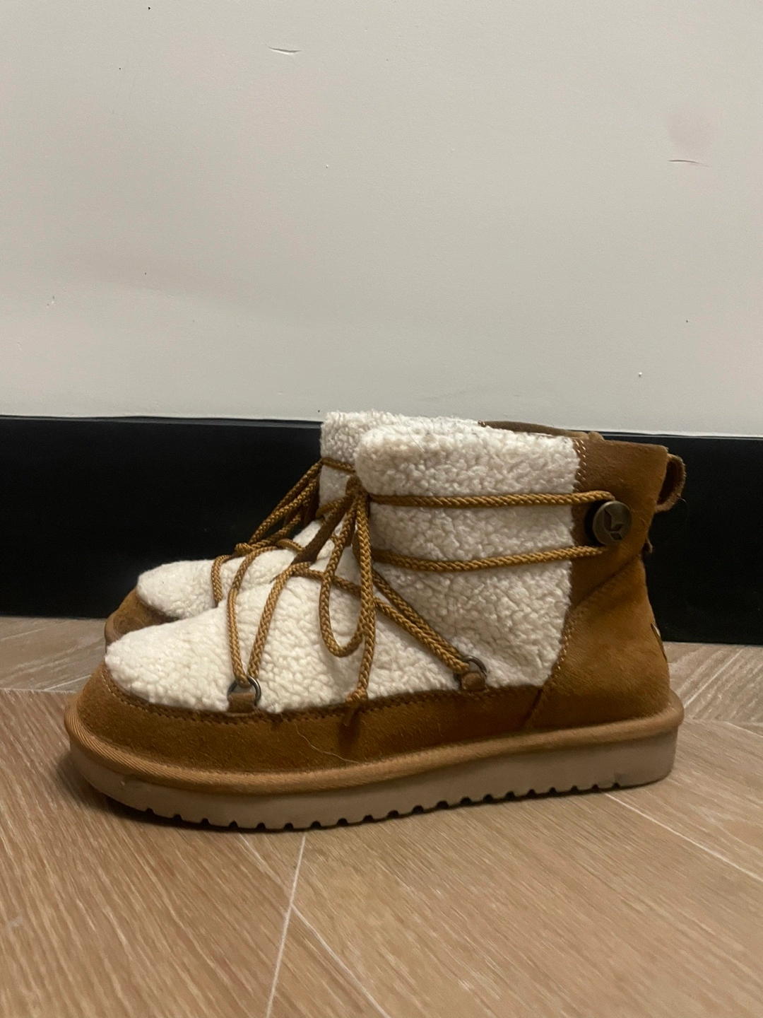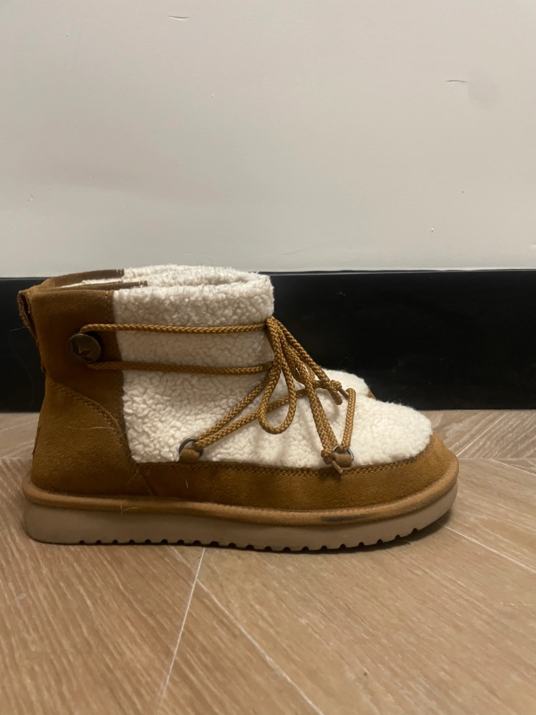 Brown and white boots. Features laces. Ankle high. KOOLABURRA BY UGG Michon Mini Chestnut Suede Sheepskin Women's Boots Size 9 Worn once, they were slightly too big but big enough to make a difference in which I wasn’t comfortable Excellent condition Pick up only