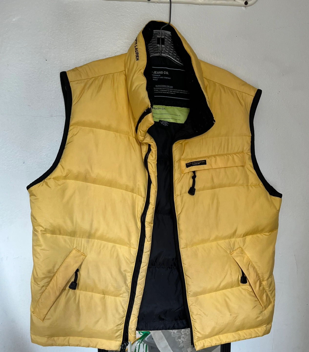 130A yellow puffer vest with black trim. It has a full-length zipper and pockets. It's a great item to wear on your walks around the neighborhood, so you can enjoy the fresh air. All my prices are negotiable! Thanks for looking! 😃