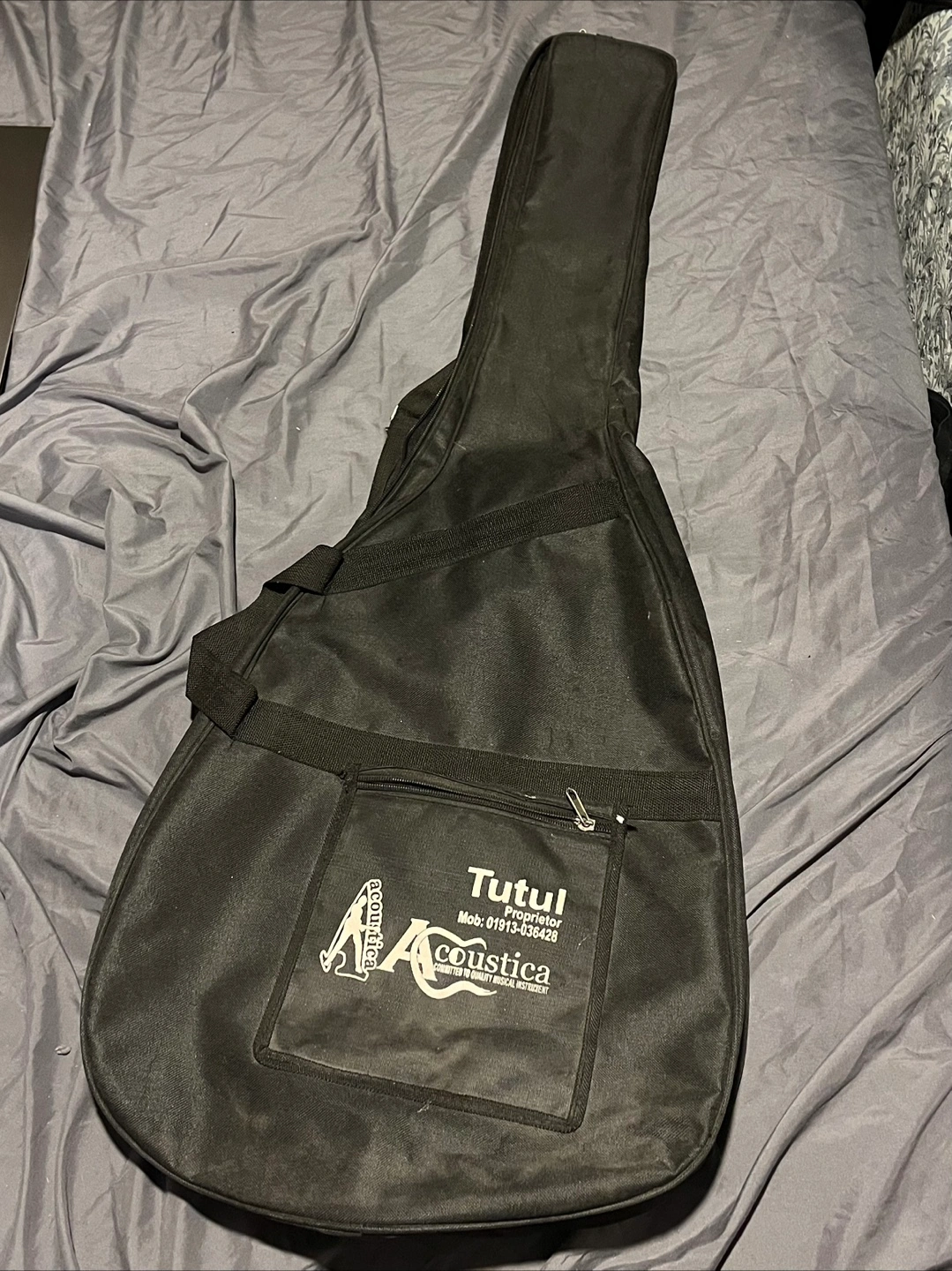 Black guitar case with a zipper and a front pocket. Comes with adjustable straps for carrying on your back.