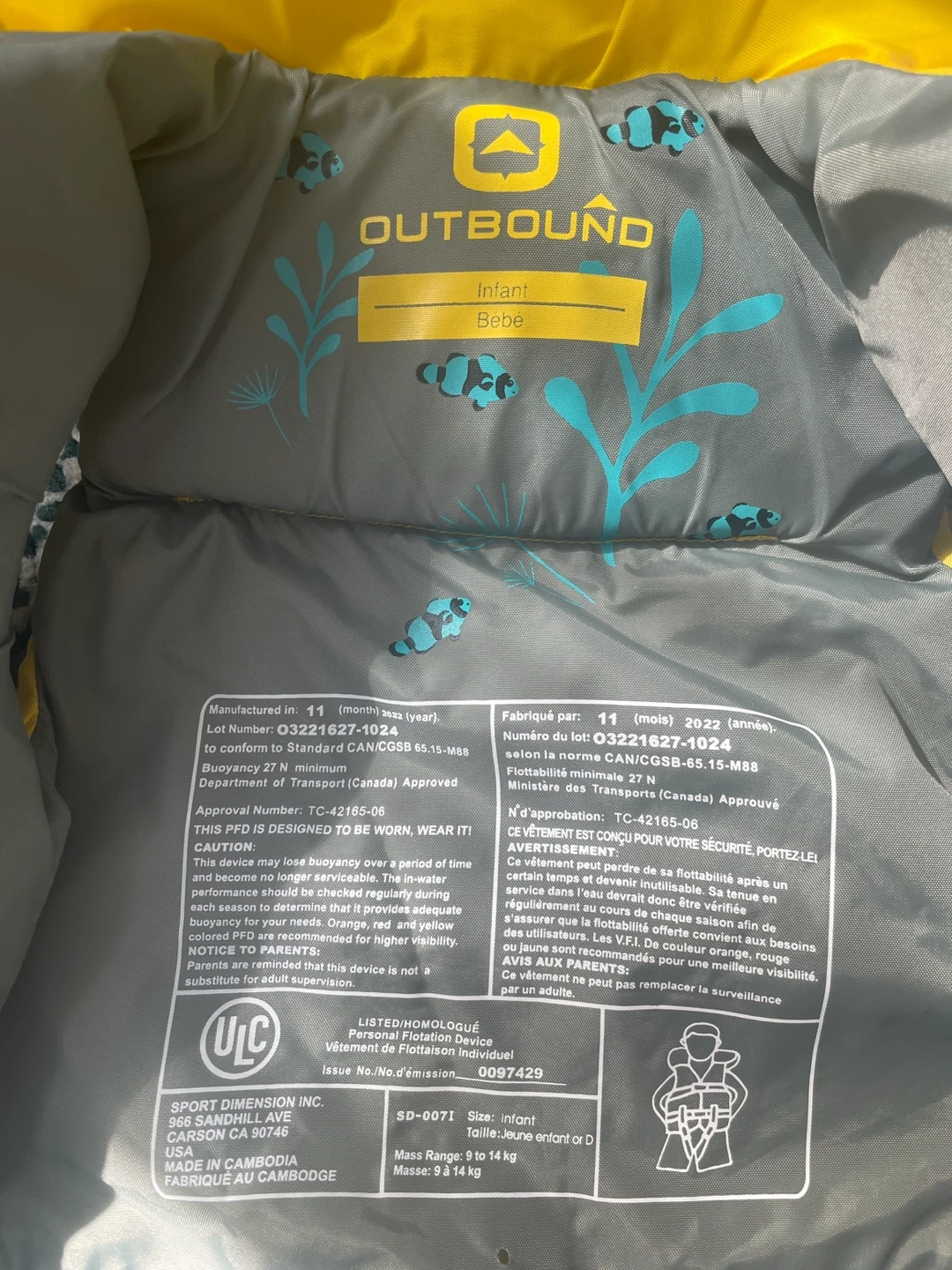 Like new, Infant Life Jacket by Outbound. 9-14kg weight range. See photo for more details. Original product link: https://www.canadiantire.ca/en/pdp/outbound-padded-pfd-infant-life-jacket-yellow-0792058p.html