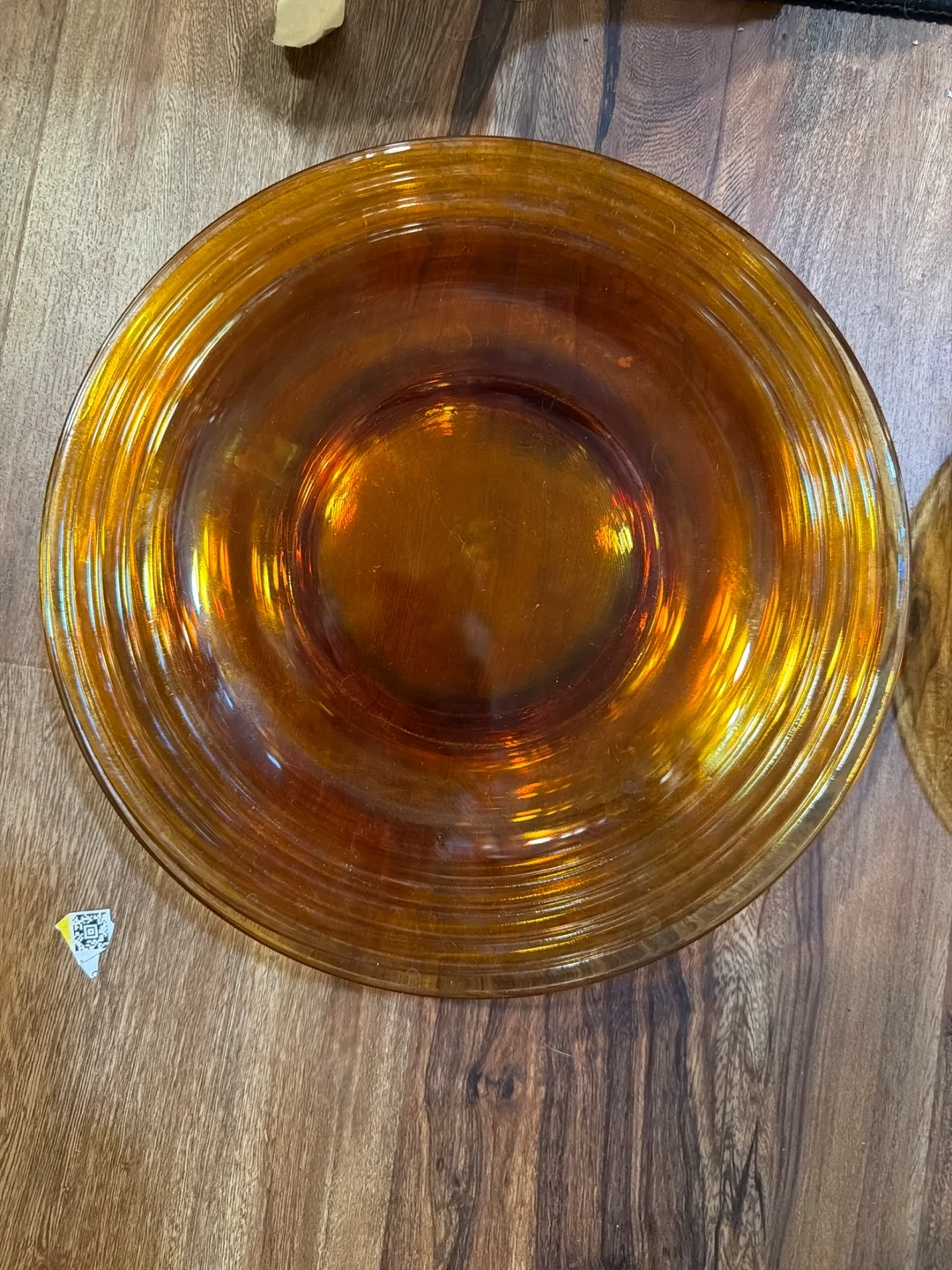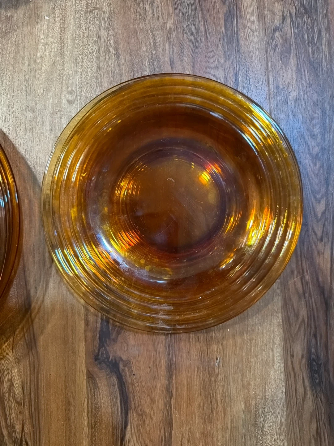 Amber glass serving bowl. Features a ribbed design around the rim. Diameter approximately 10 inches for dinner plates and 8 inches for dessert plates .