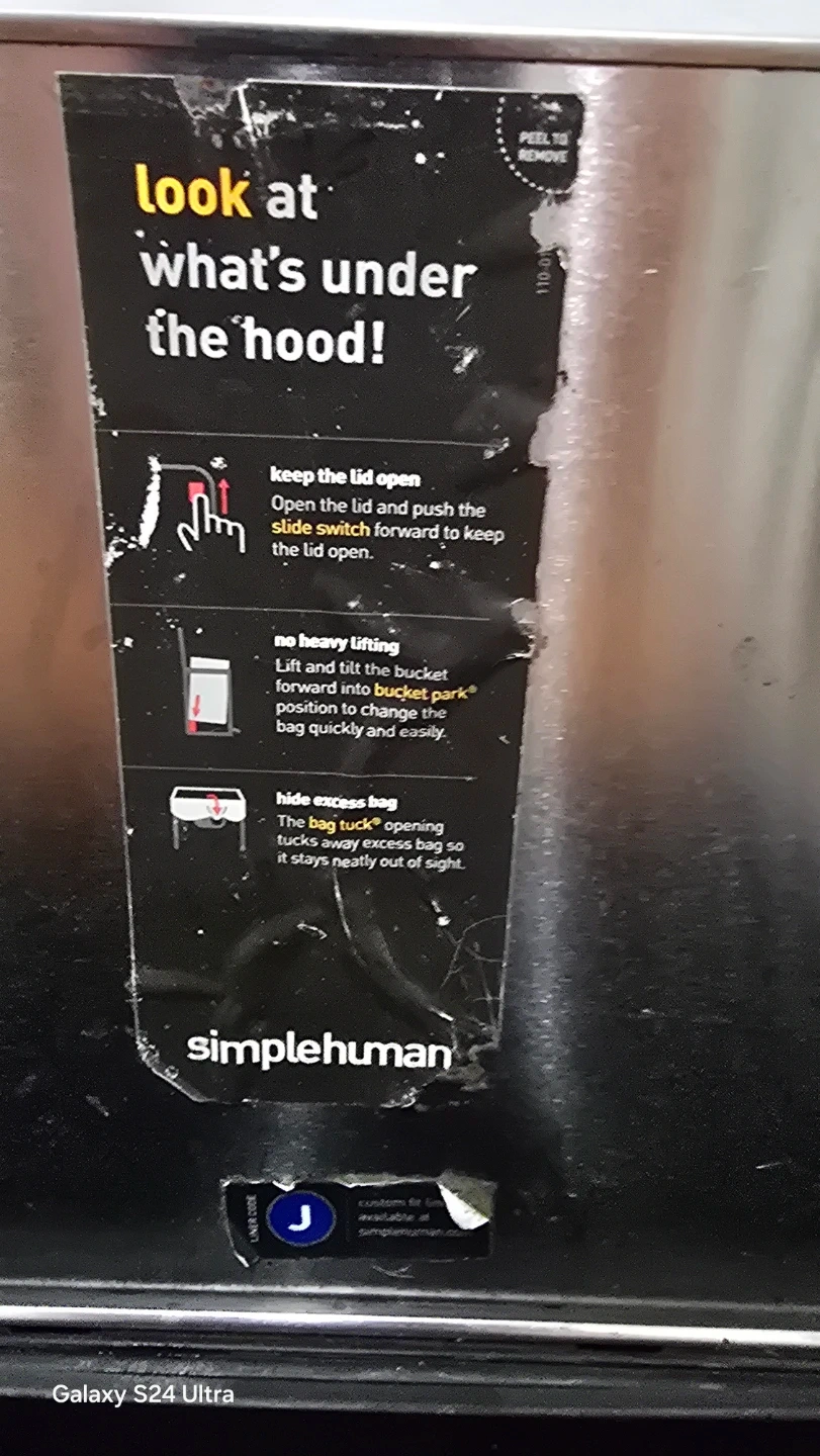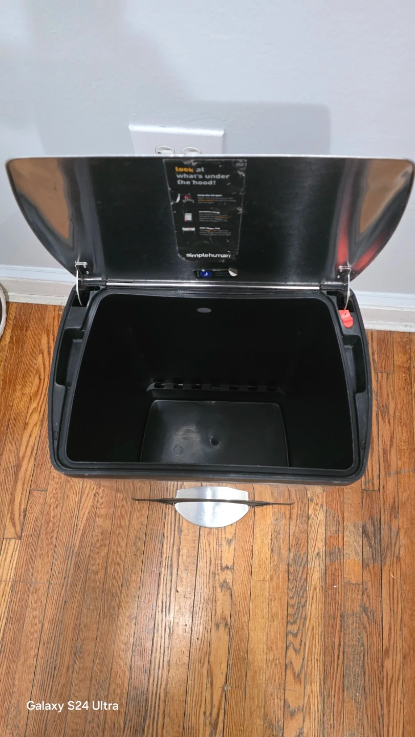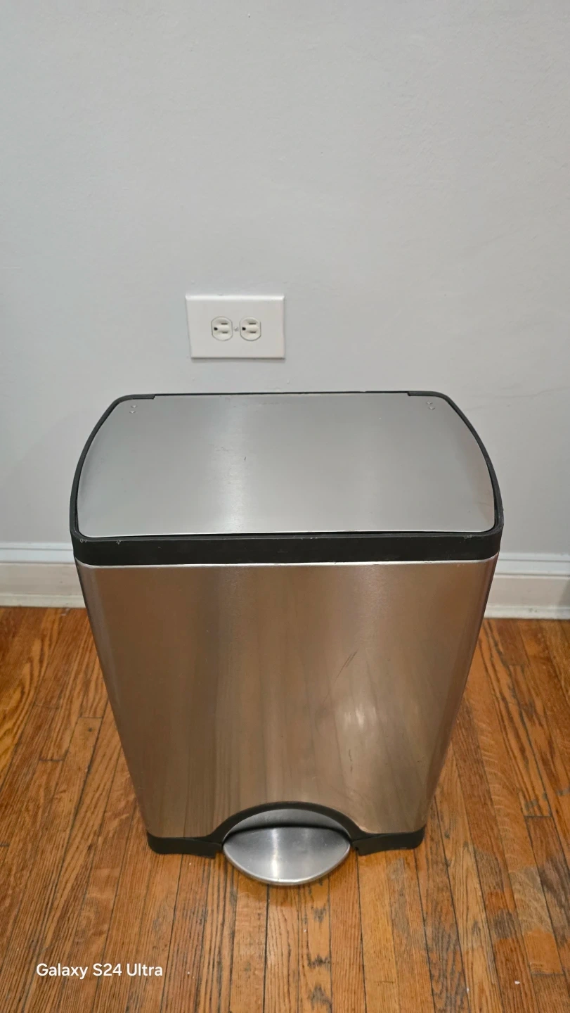 This is a Simplehuman stainless steel step trash can. It features a pedal for hands-free operation and a lid that stays open with a slide switch. The interior bucket is removable for easy cleaning. It's designed to hide excess bag. 15 gallons