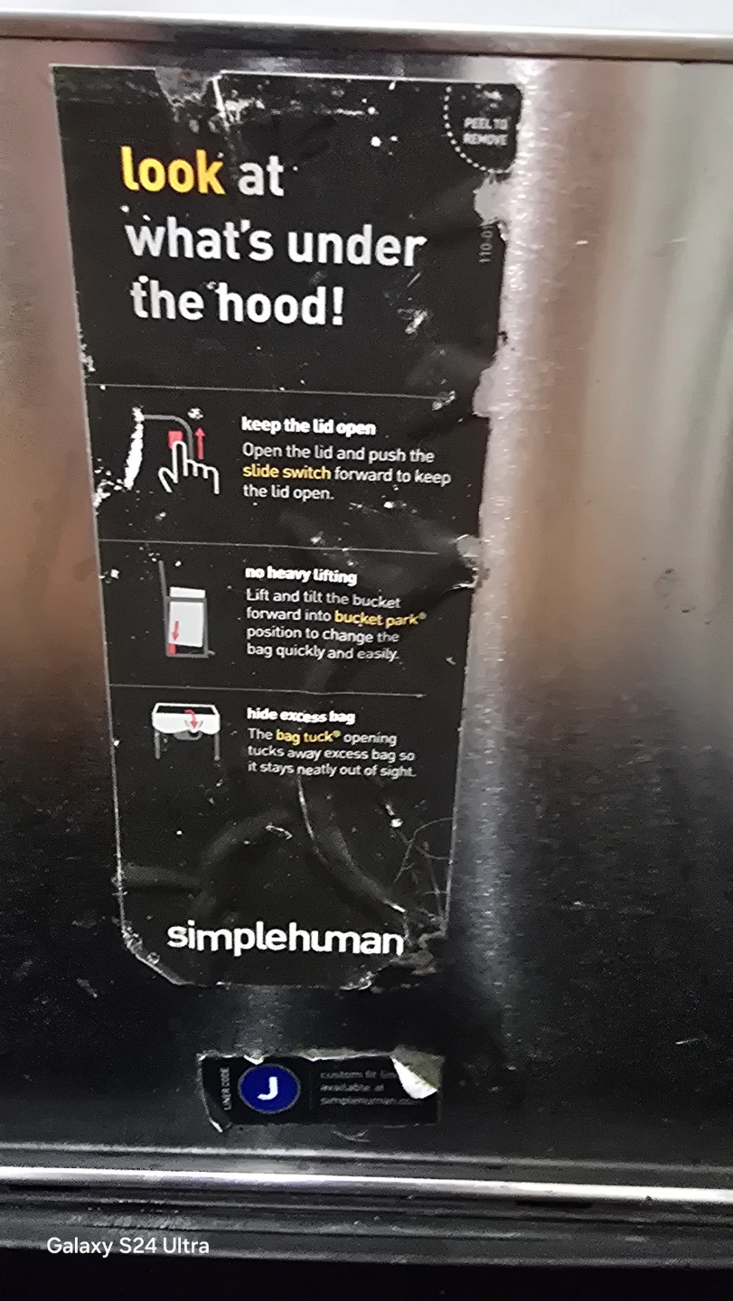 This is a Simplehuman stainless steel step trash can. It features a pedal for hands-free operation and a lid that stays open with a slide switch. The interior bucket is removable for easy cleaning. It's designed to hide excess bag. 15 gallons
