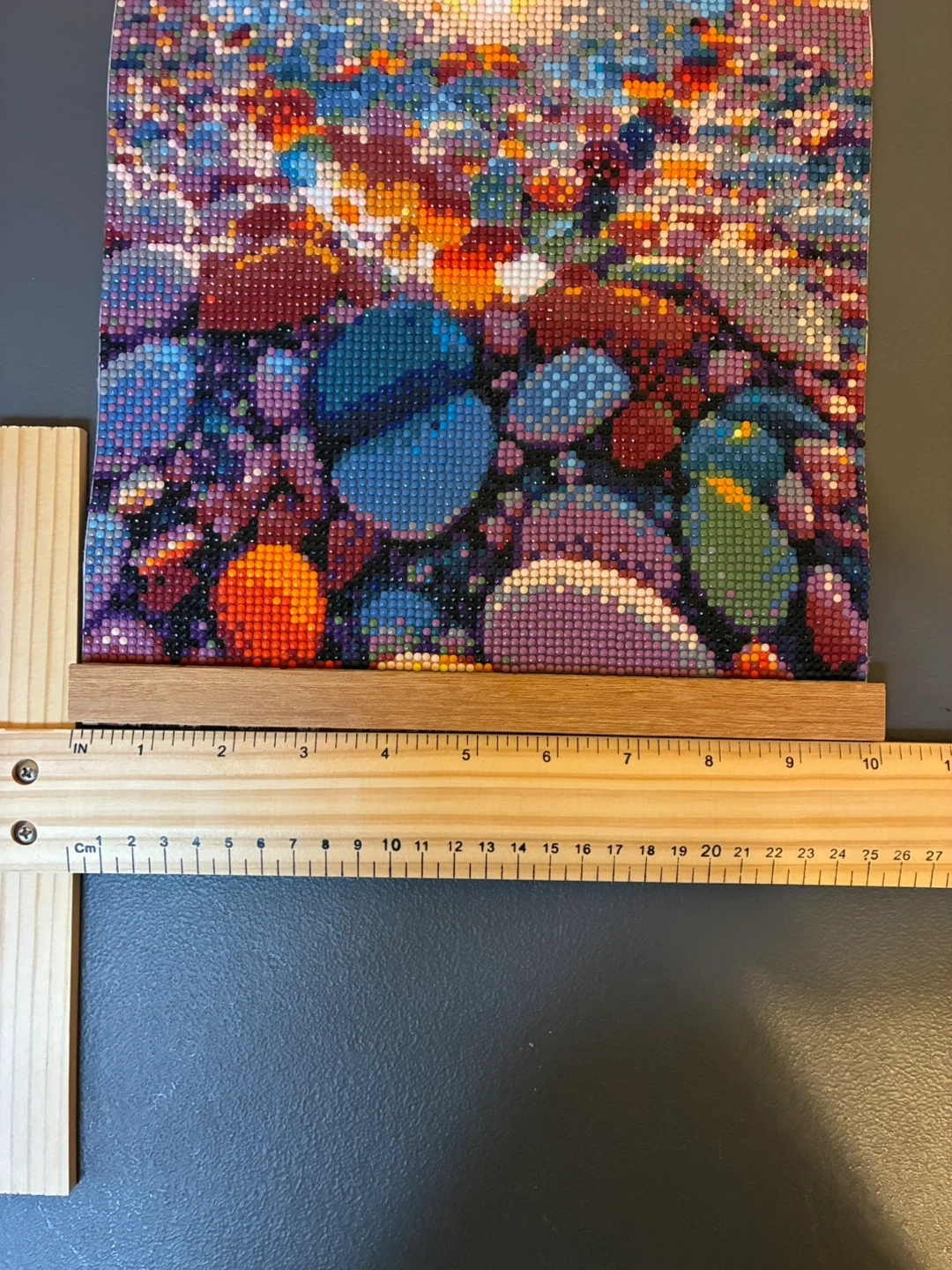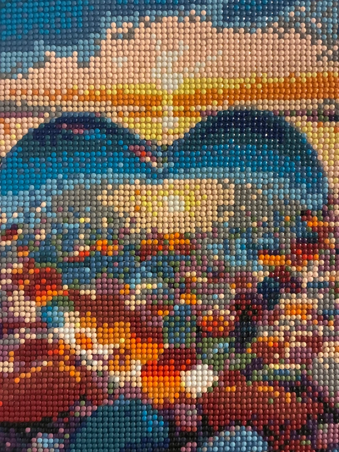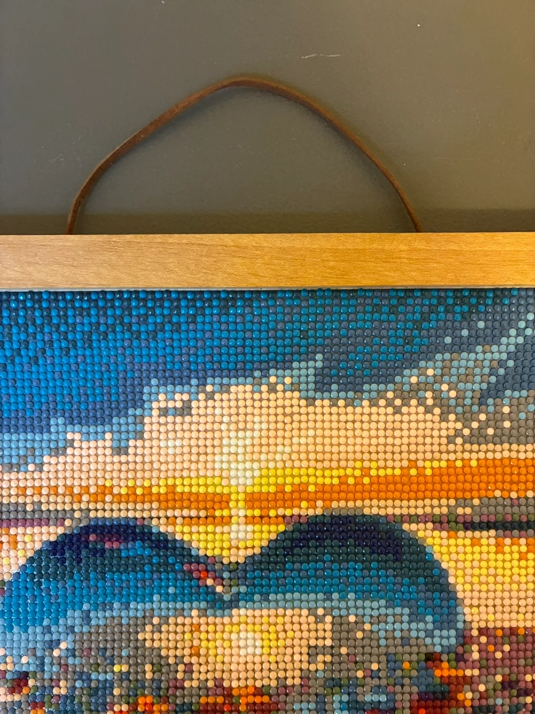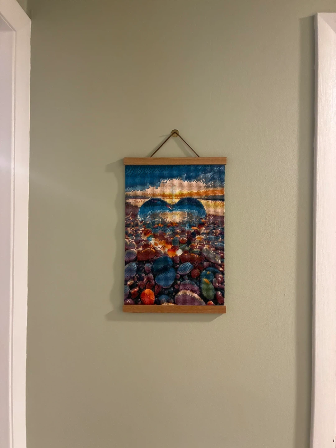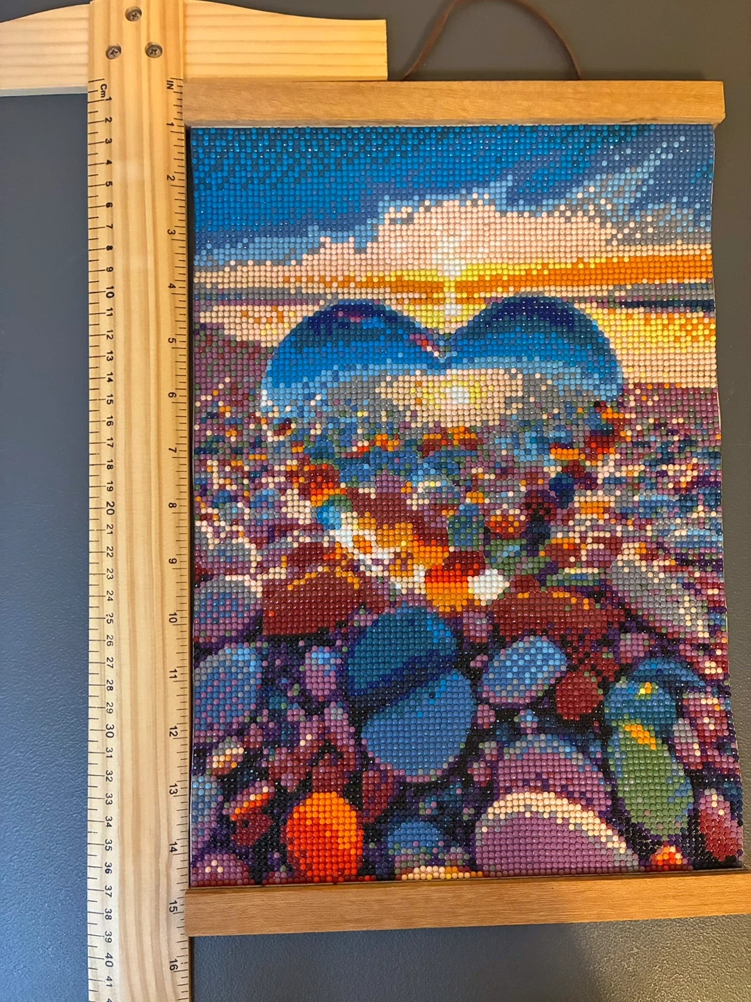 Diamond painting artwork of a heart shape reflecting the sunset over a beach with colorful pebbles. Measures approximately 9.5 x 15 inches. Mounted in a wooden frame with a leather cord for hanging. Perfect for adding a touch of sparkle to your home decor!