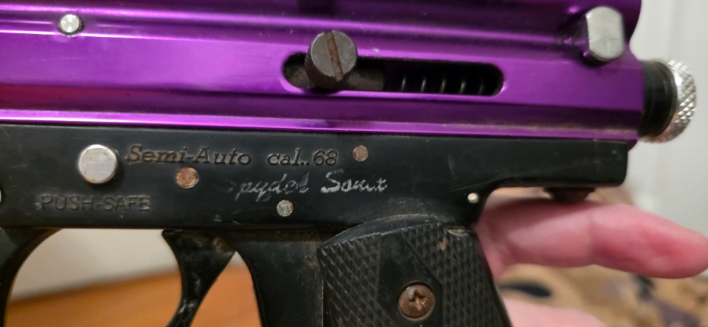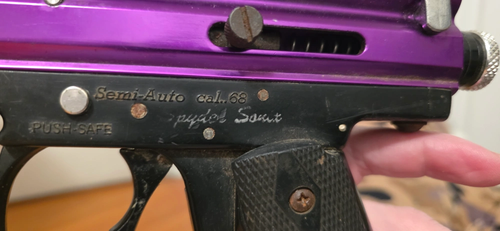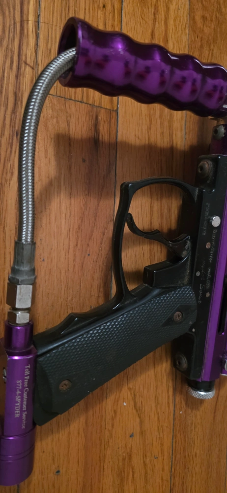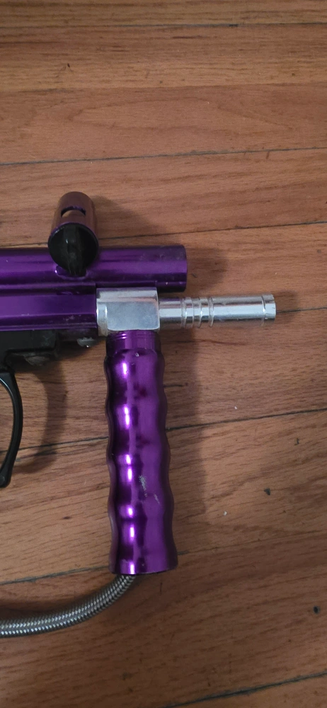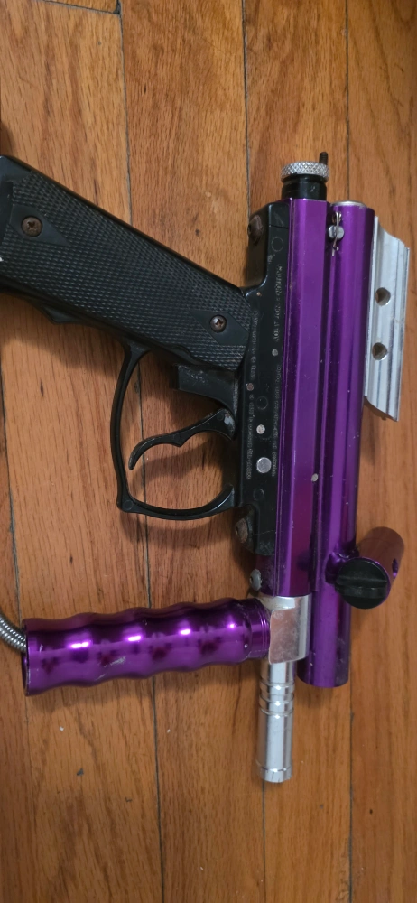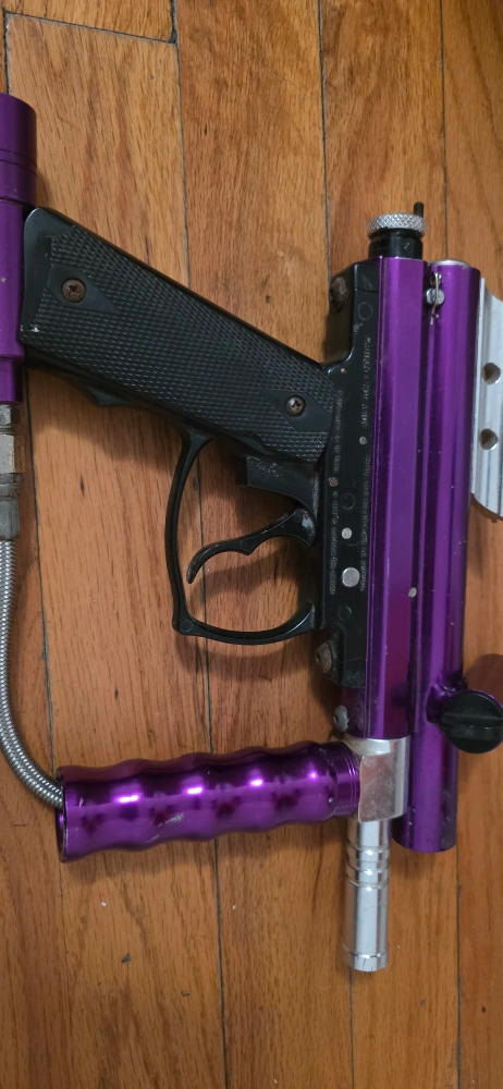 23A purple and silver paintball marker. The marker has a grip and trigger, along with a grip located at the bottom. The marker comes with a hose. Think of the memories you'll make while playing a fun game with this marker. as is selling it for cheap needs some cleaning