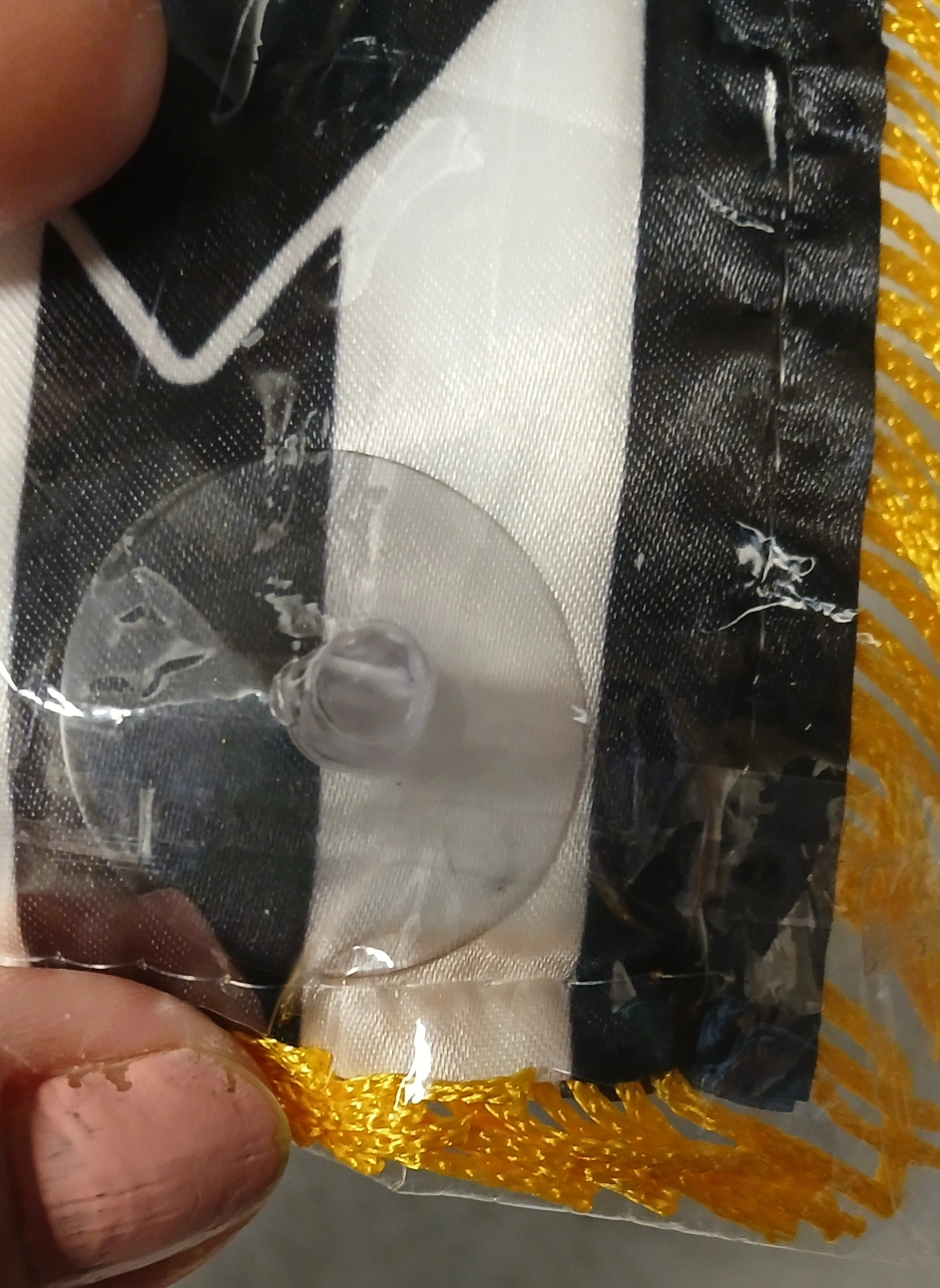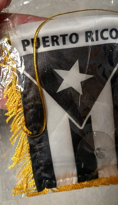 381A flag pennant. Features the Puerto Rico flag design in black and white Includes a gold cord and tassels,and suction cup,A great item to display anywhere that you want to feel closer to home.