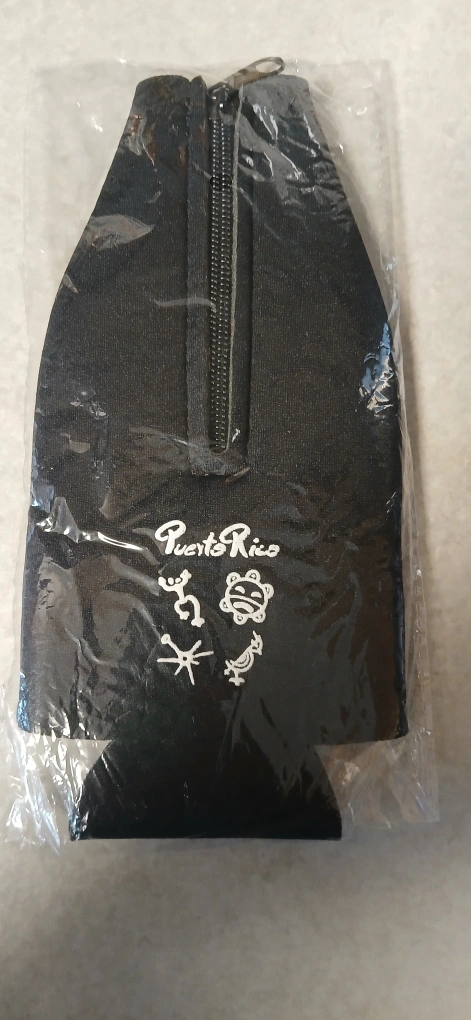 381A black drink cooler. Features a zipper. Has the text "Puerto Rico" printed on it. Could be used to keep a drink cold on a hot summer day and hidden last one of this kind,it's meant to be used with a beer glass bottle but you get it, you can buy all or separately.