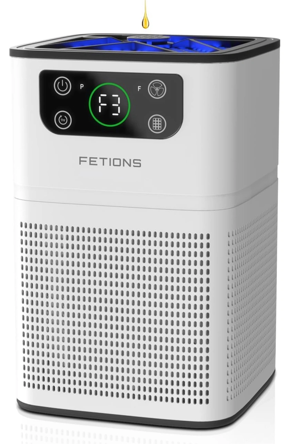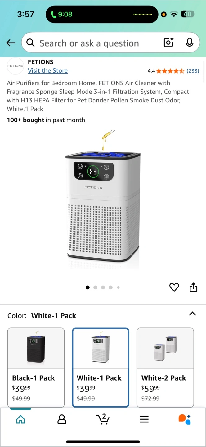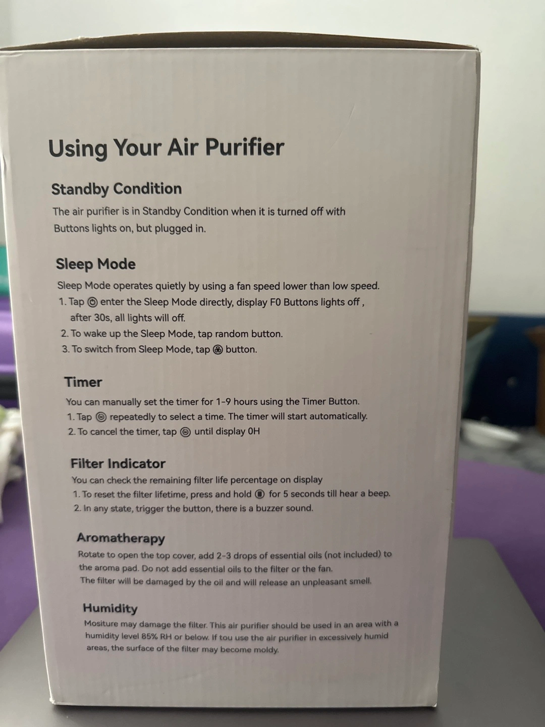The air purifier is white and black. It has a square shape. On the front, there are several buttons and a screen. It can operate with 3-stage filtration. It has an aromatherapy option to help you relax.