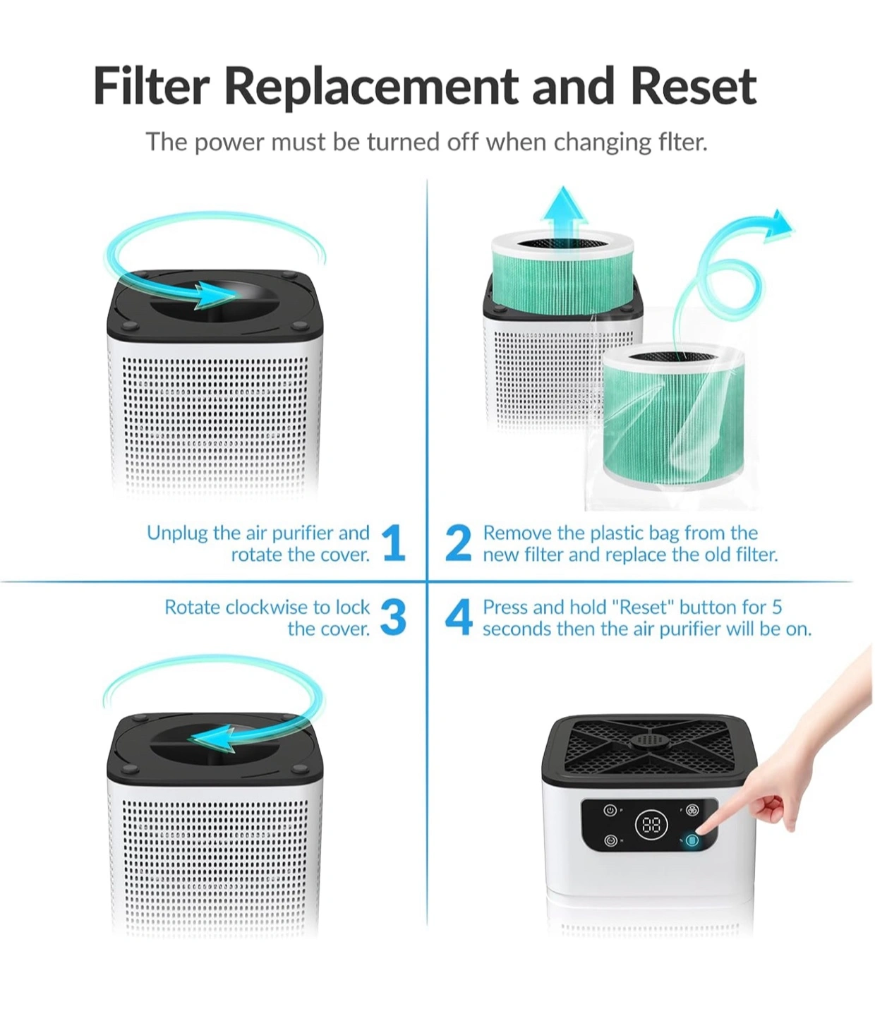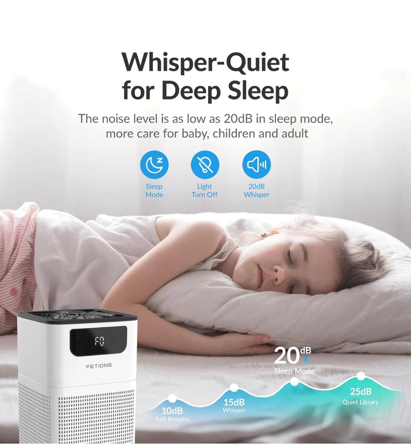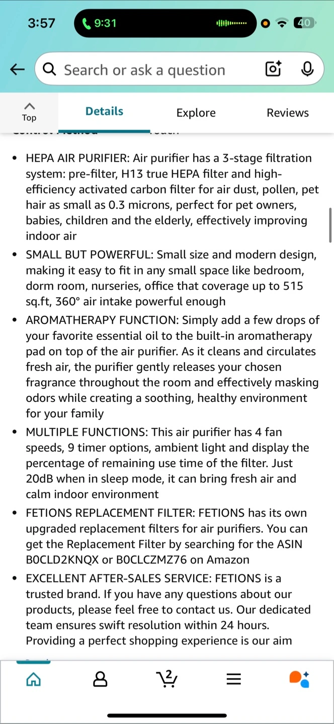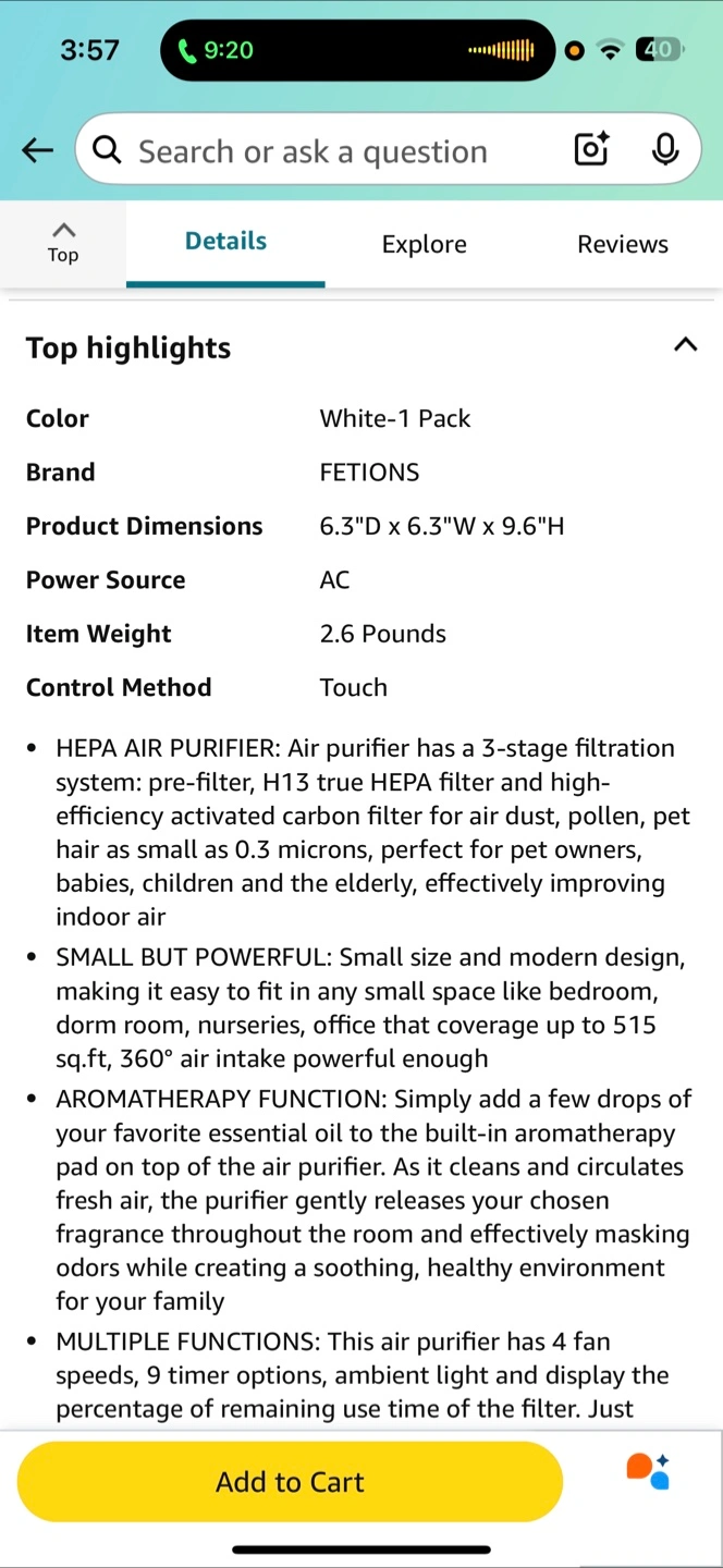 The air purifier is white and black. It has a square shape. On the front, there are several buttons and a screen. It can operate with 3-stage filtration. It has an aromatherapy option to help you relax.