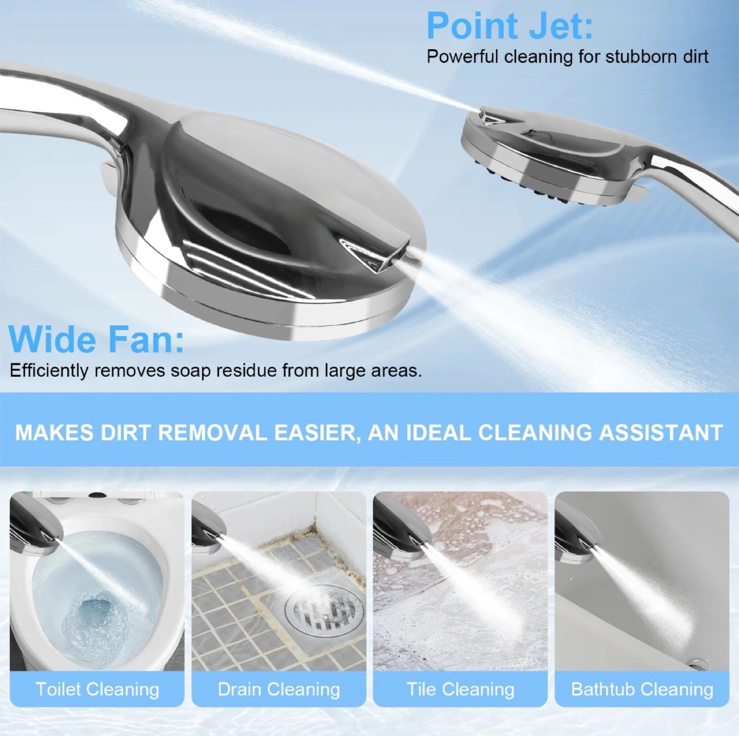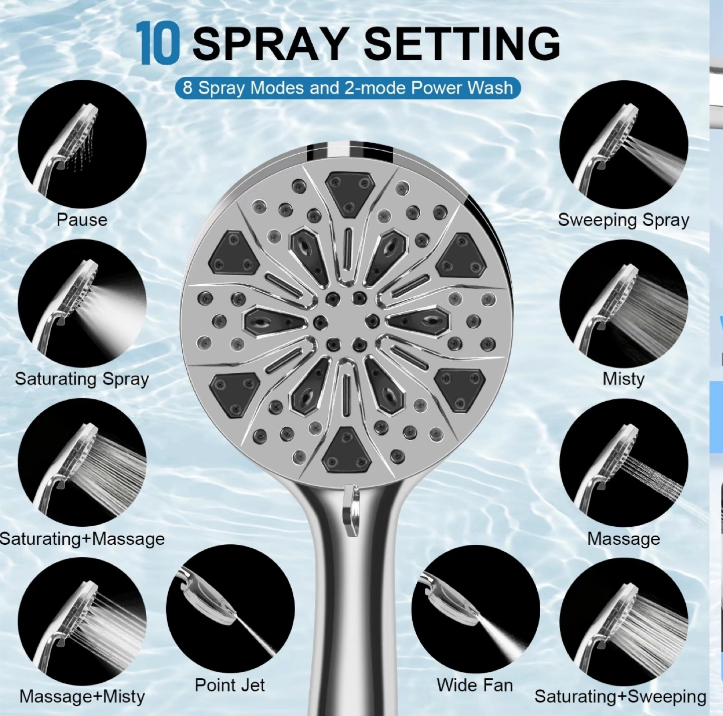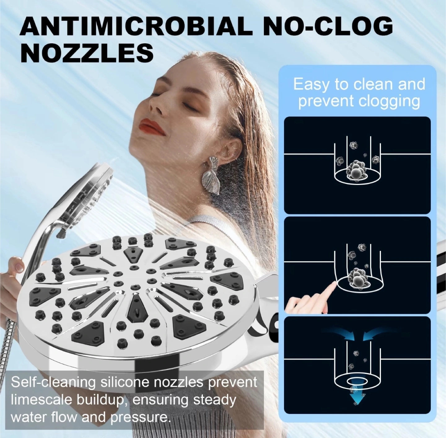 Chrome shower head. Features antimicrobial nozzles. Provides a soothing shower experience every time.