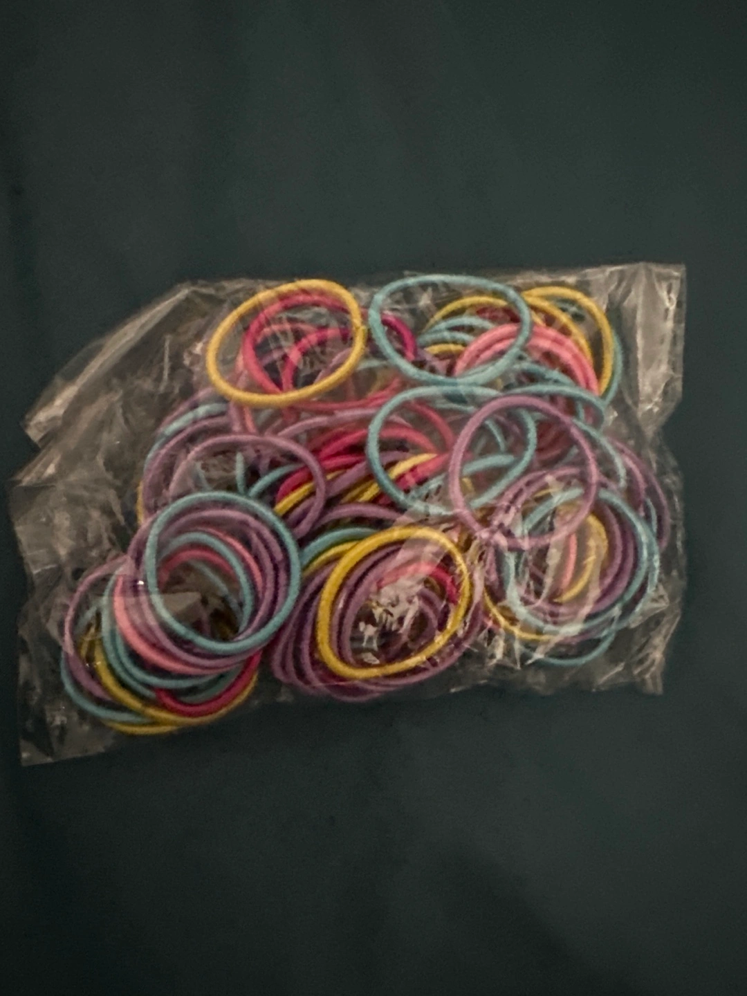 A large quantity of colorful hair ties. Many different colors like yellow, pink, purple, and blue. These are perfect for a simple hairstyle.