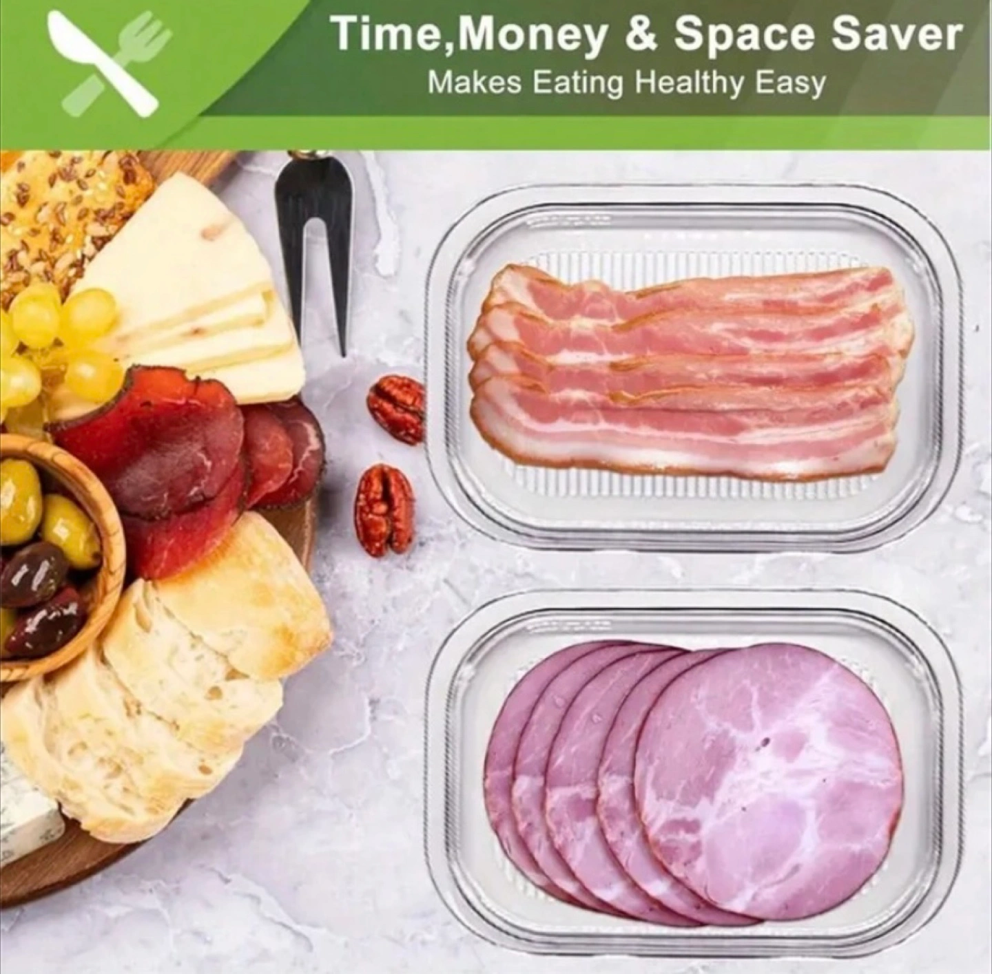 79A food storage container with a transparent body and a white lid. The container appears to be stacked, layered with multiple compartments. Keep your food fresh and organized with this food storage set, a great way to reduce food waste.