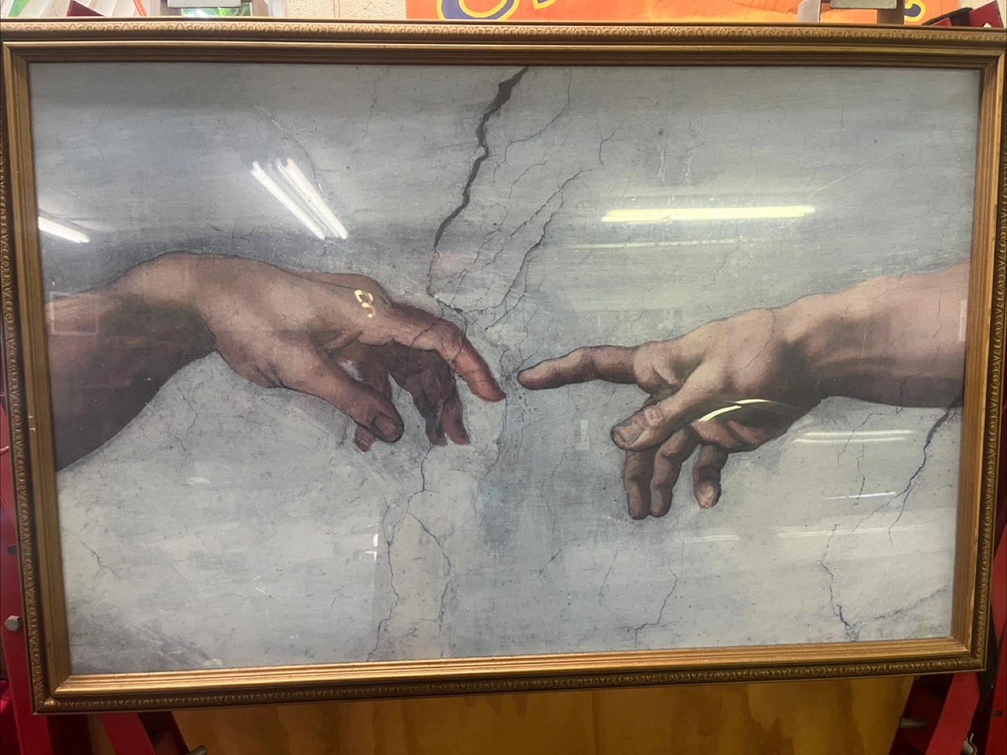 A print of Michelangelo's famous Creation of Adam painting. A large, rectangular frame. The image appears to depict two hands almost touching. Place this art in your living room, and feel a sense of peace.
