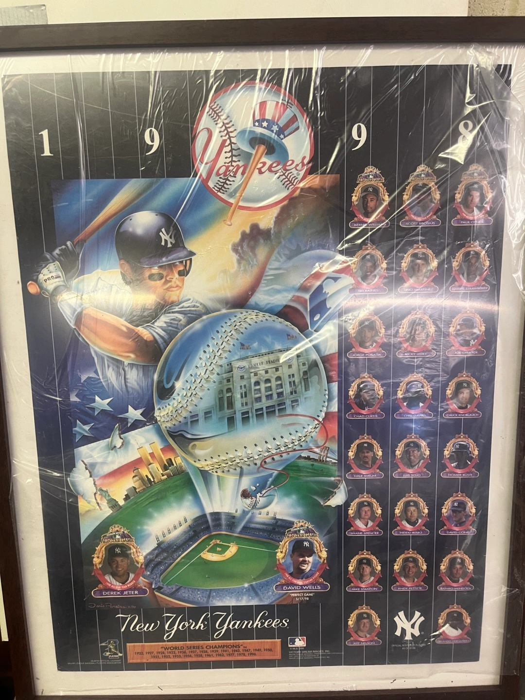 The New York Yankees poster is framed. Features several iconic baseball players and the Yankees' logo. A great addition to any fan's wall.