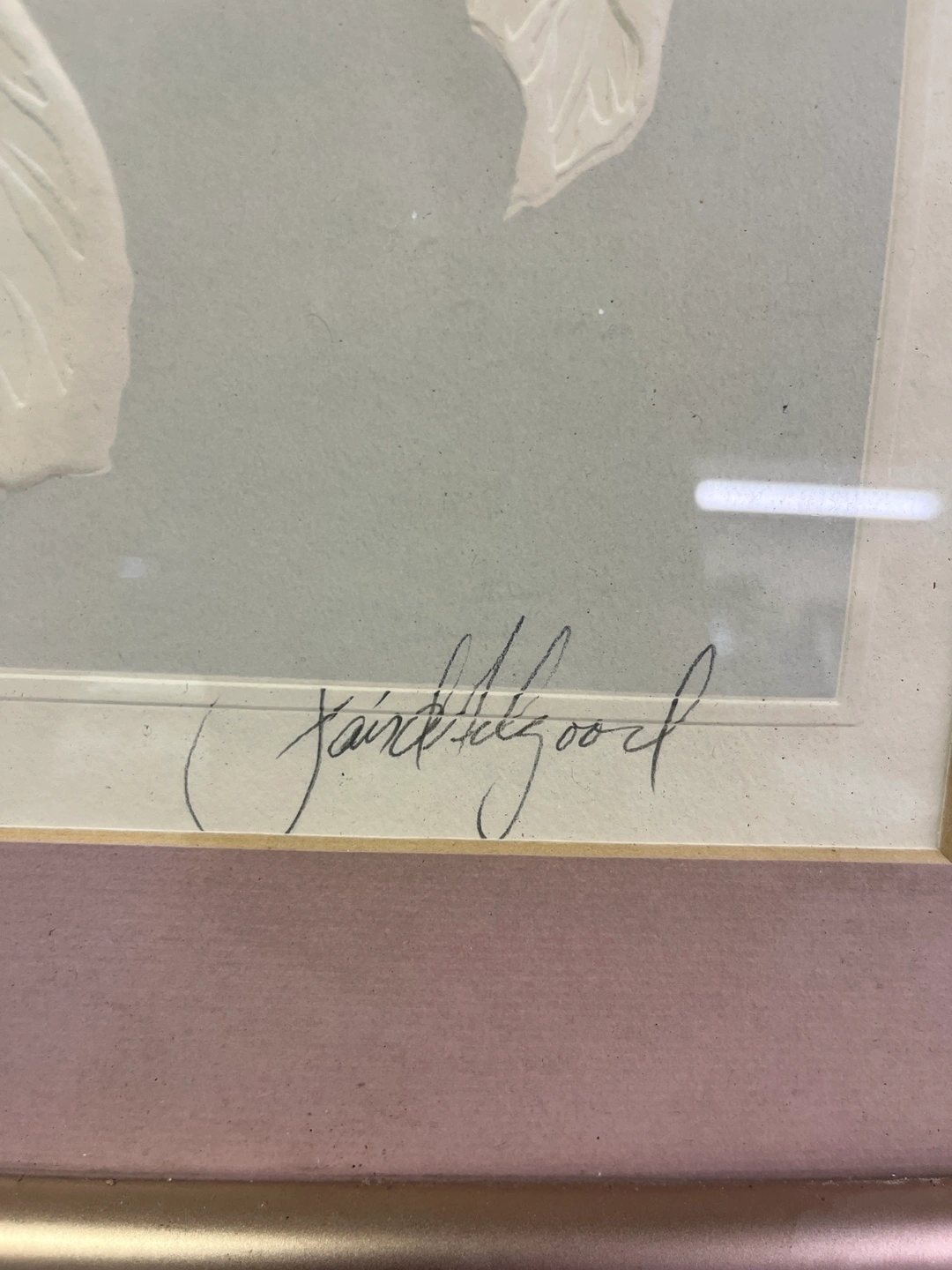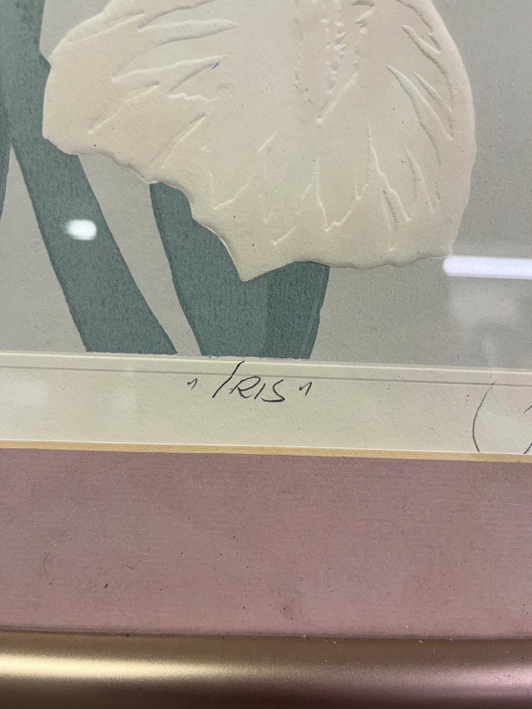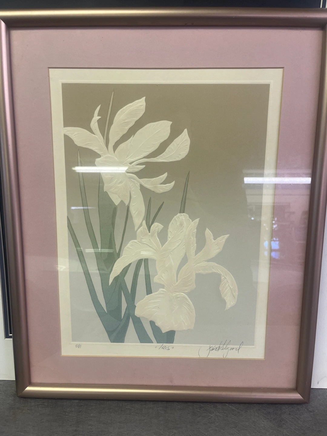 A beautiful framed floral print. Artwork is mostly shades of white and green. The print is framed with a pink mat. A wonderful addition to bring peace into your home.