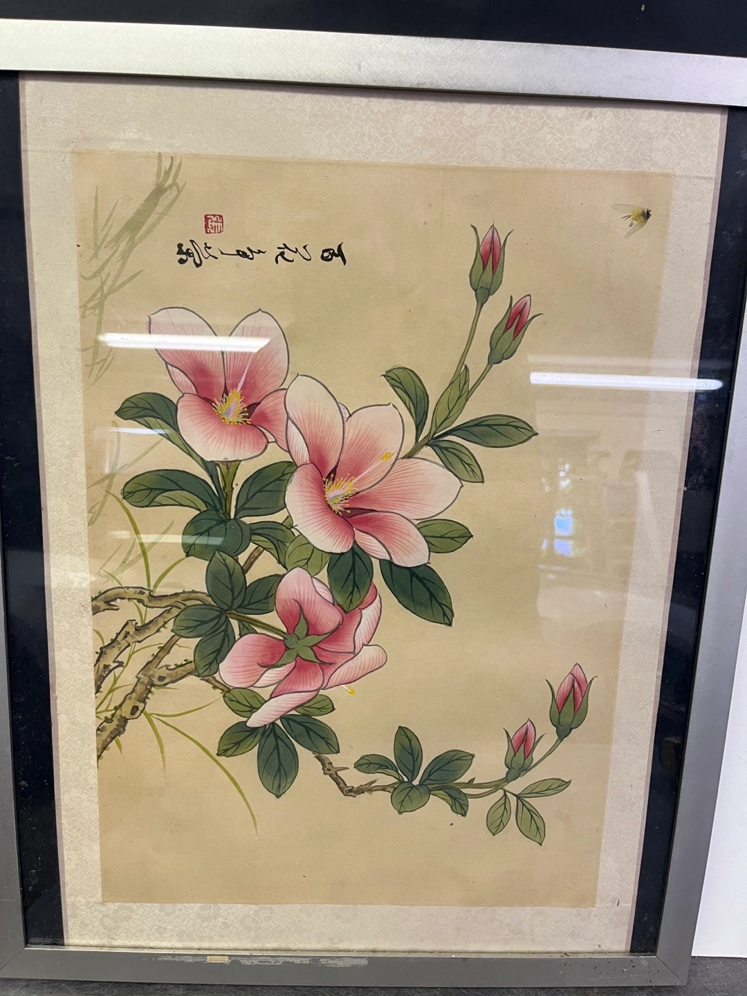 Beautiful framed floral watercolor painting. Features pink flowers with a unique style. Perfect for bringing a tranquil feel to your home.