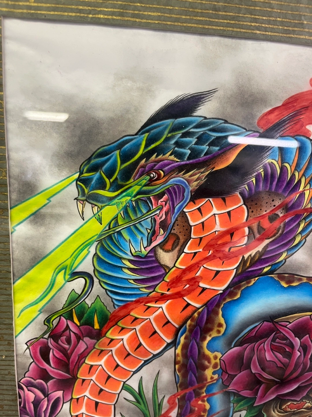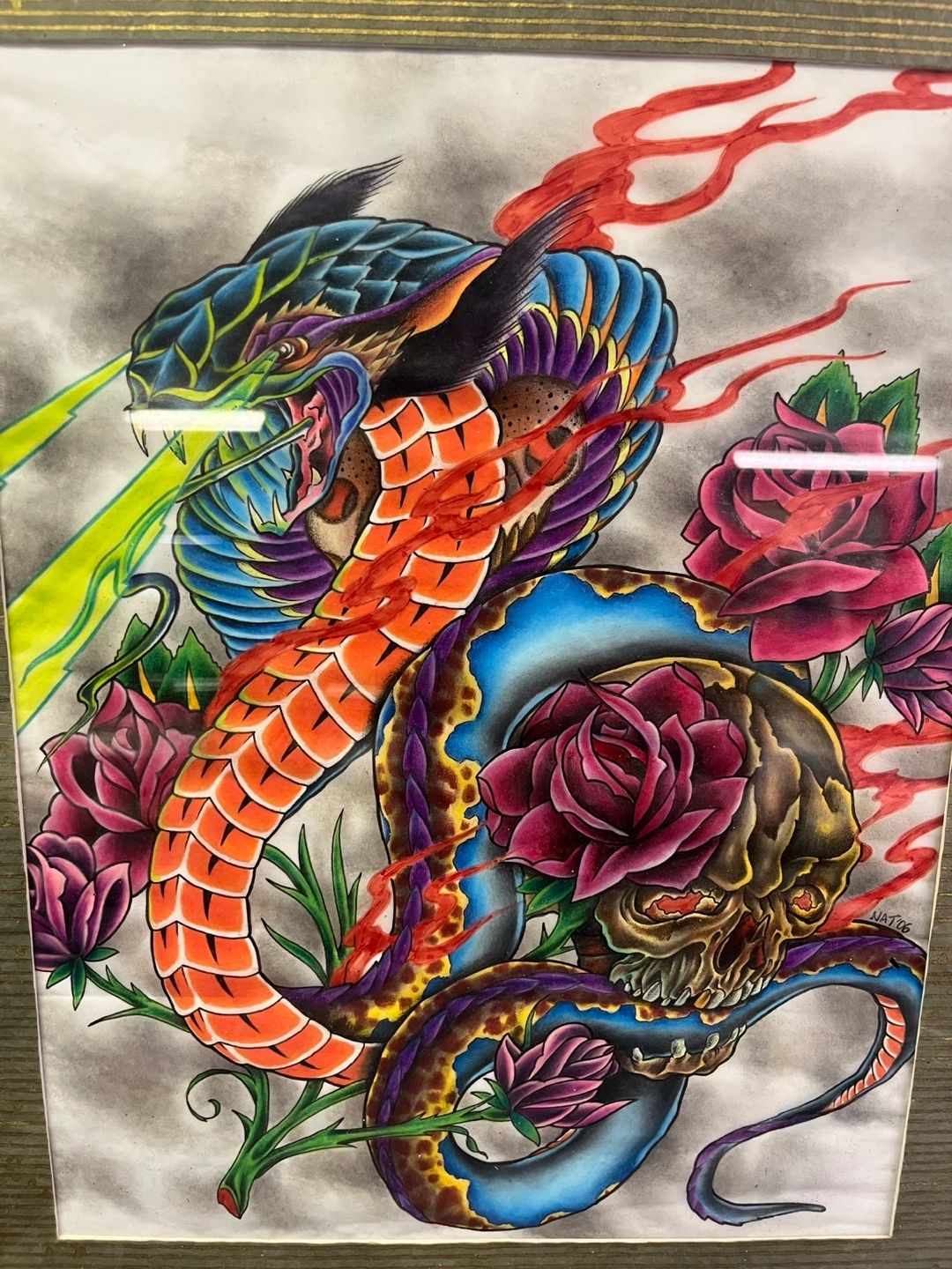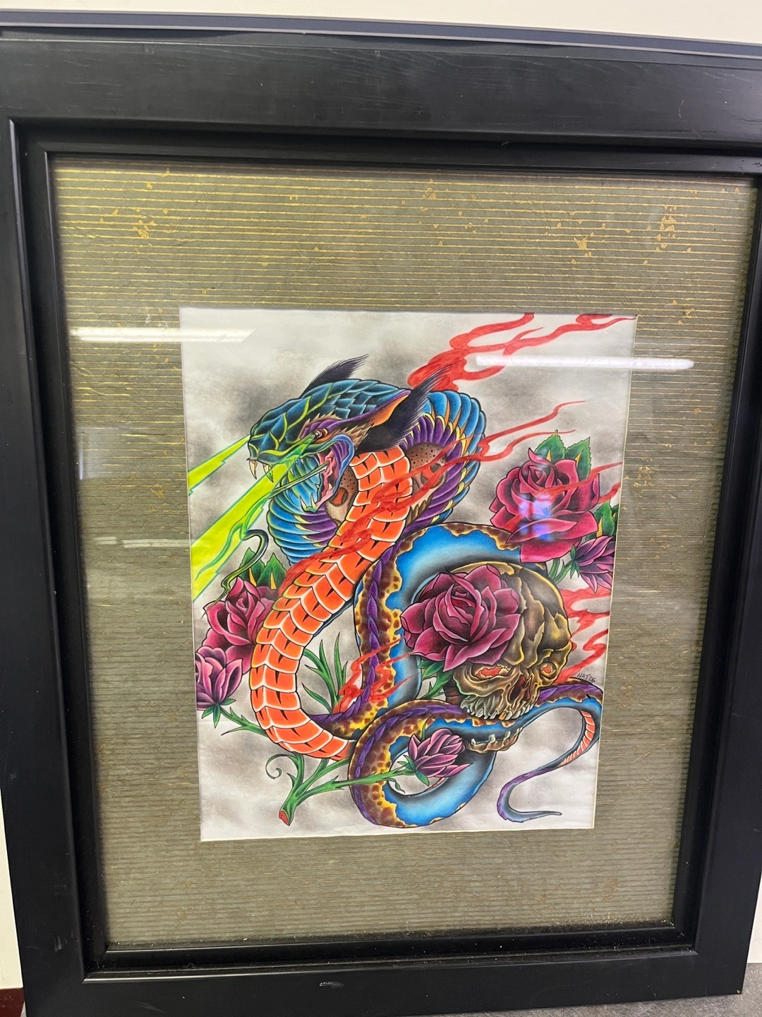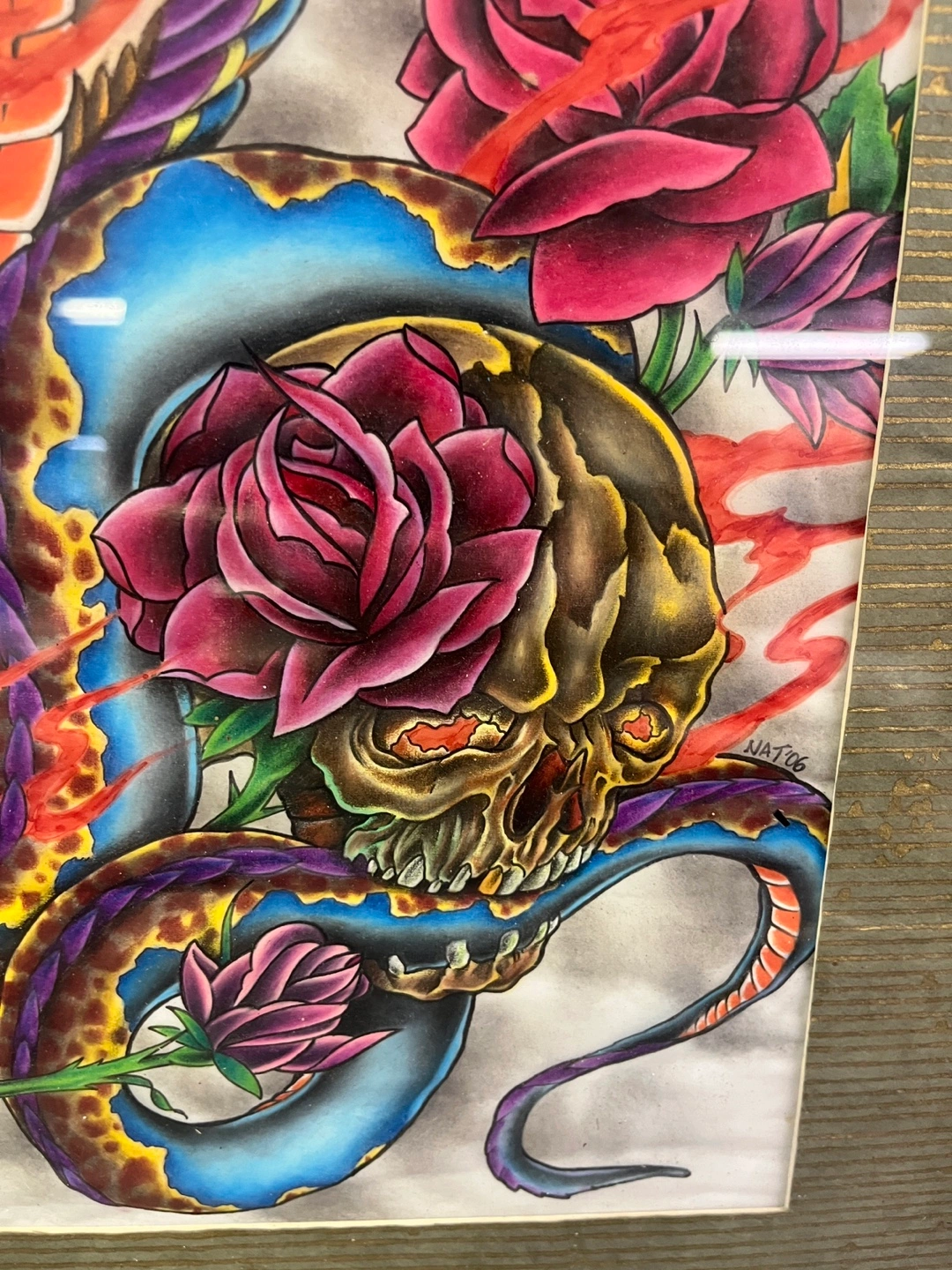 Hand drawn Colorful artwork, featuring a skull and snake with roses. It is framed. Imagine this artwork in a cozy space where you can relax.