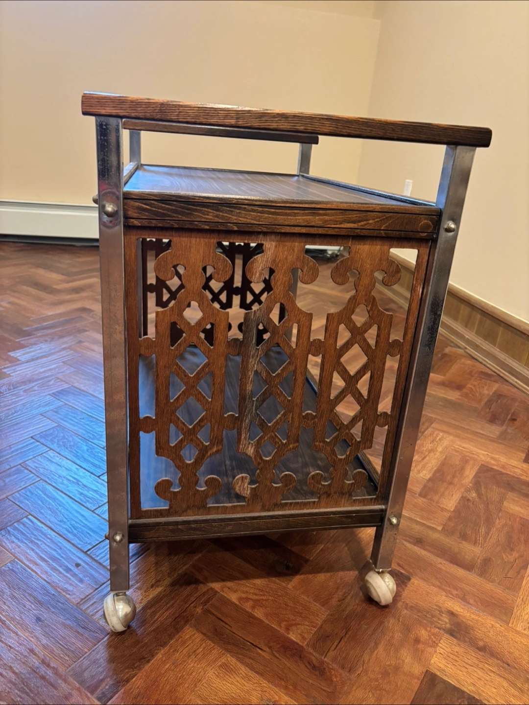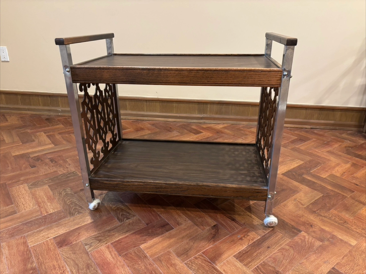 10Serving cart, featuring a dark wood finish. Includes a second shelf. The frame appears to be made of metal with decorative cutouts. It would be a lovely addition to any living space.