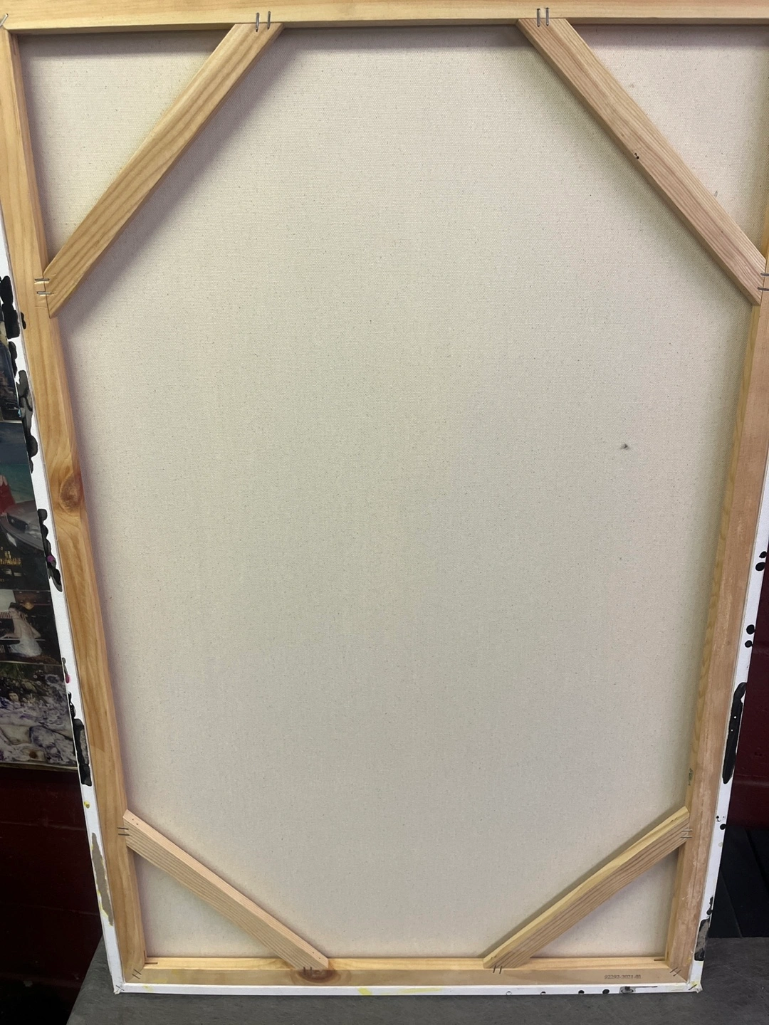 An original abstract painting. Features a colorful design with bright pink, yellow, and black. Stretched on a wooden frame. Displaying this painting will add a nice touch of color to your walls.