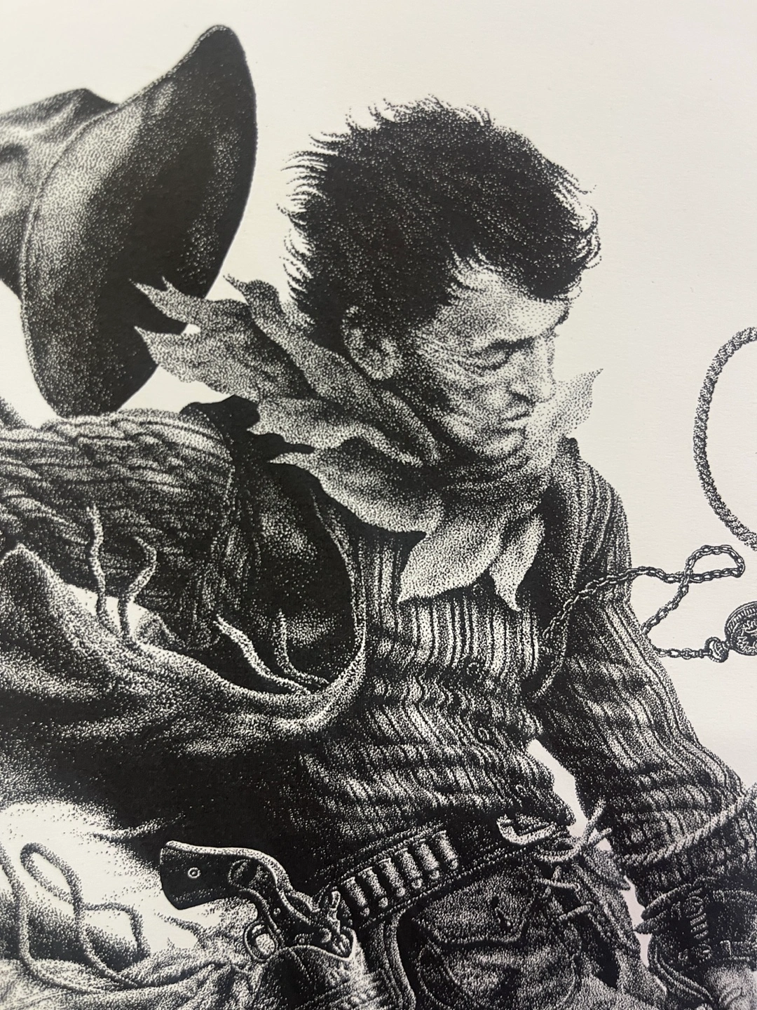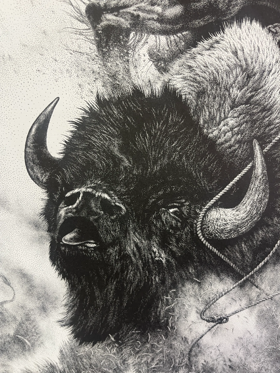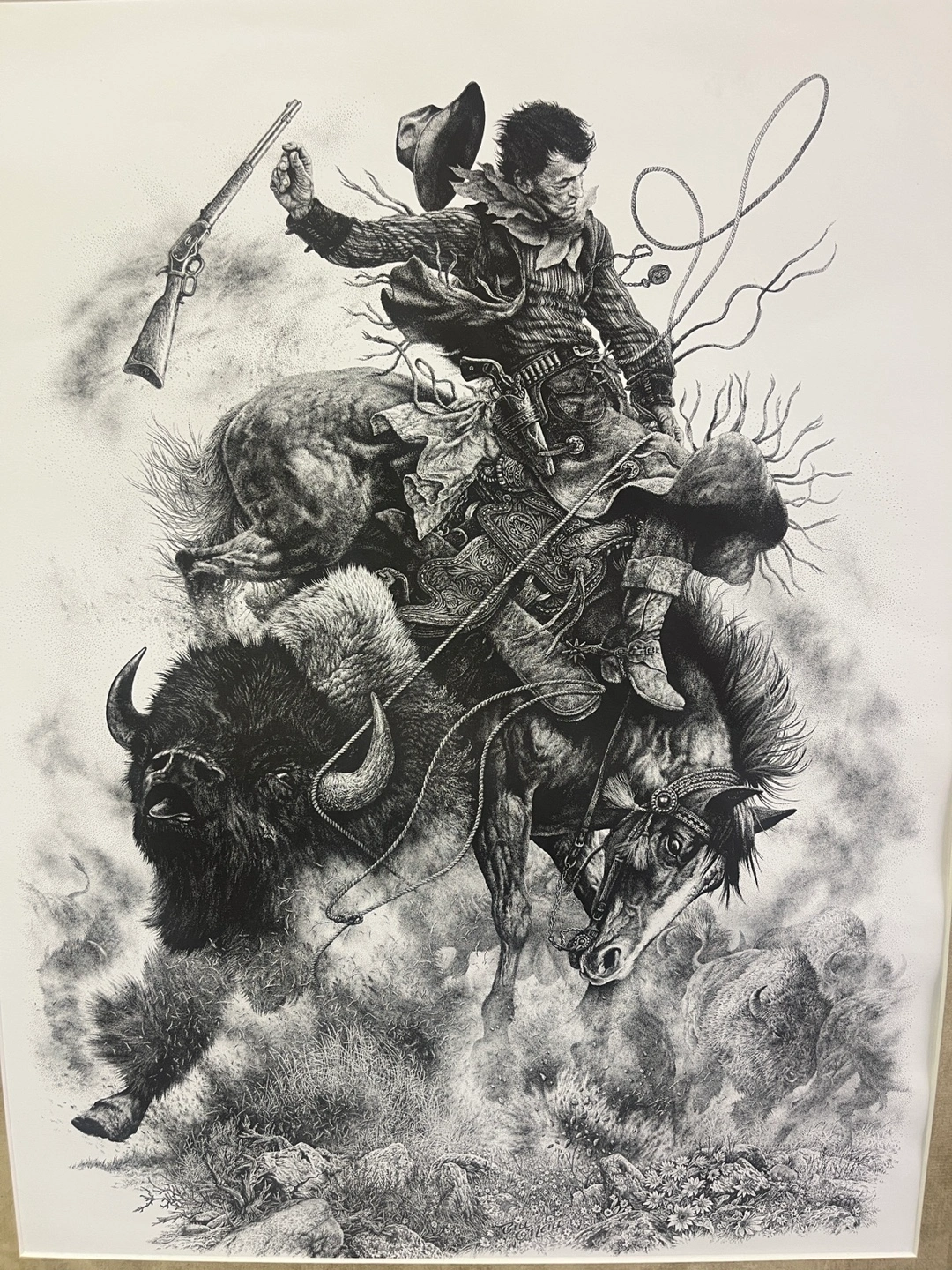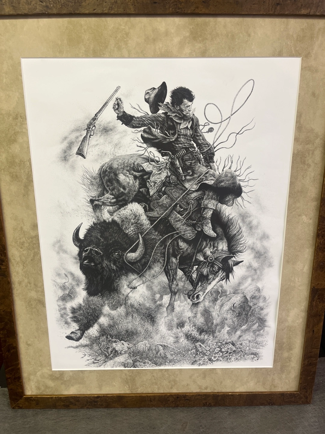 Artwork of a cowboy riding a horse and a bison. Detailed stippling. Comes with a frame. It would be a wonderful piece for your living room or bedroom.