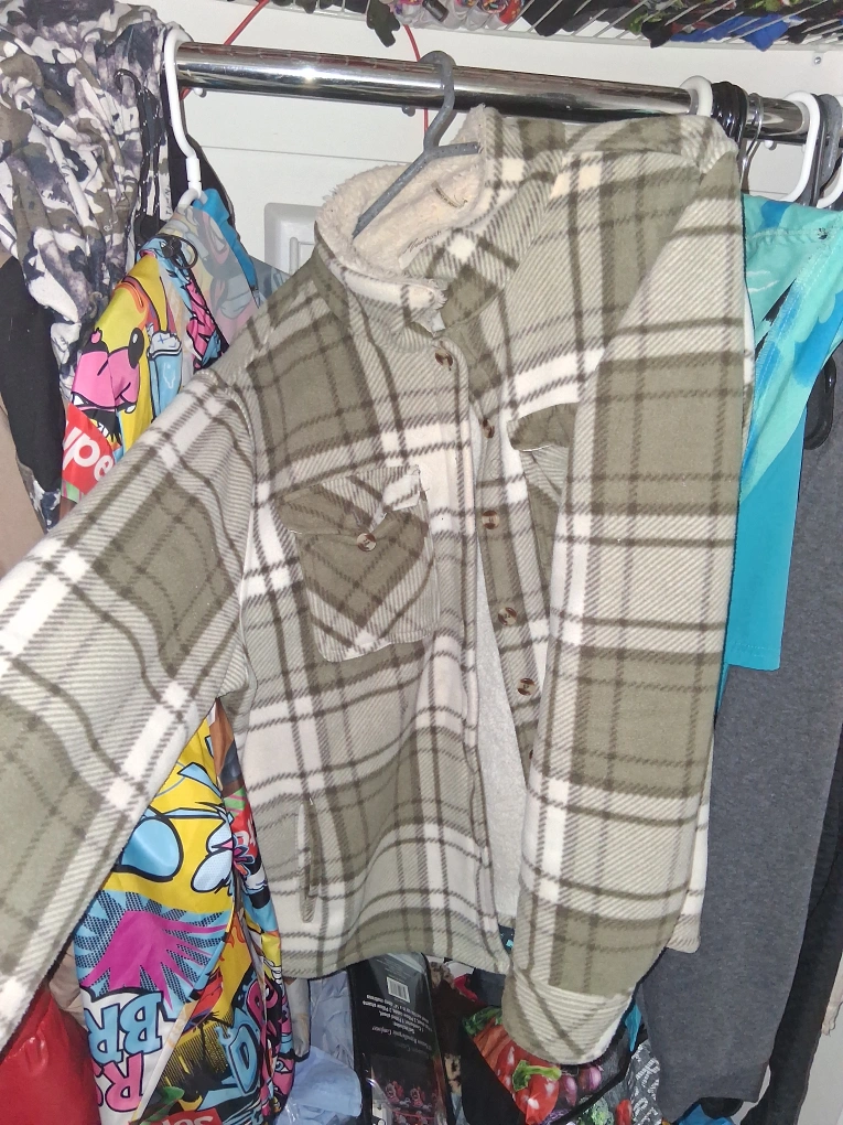 A soft plaid button-up jacket. Features a sherpa lining. This jacket would be perfect for snuggling up on a cold day.