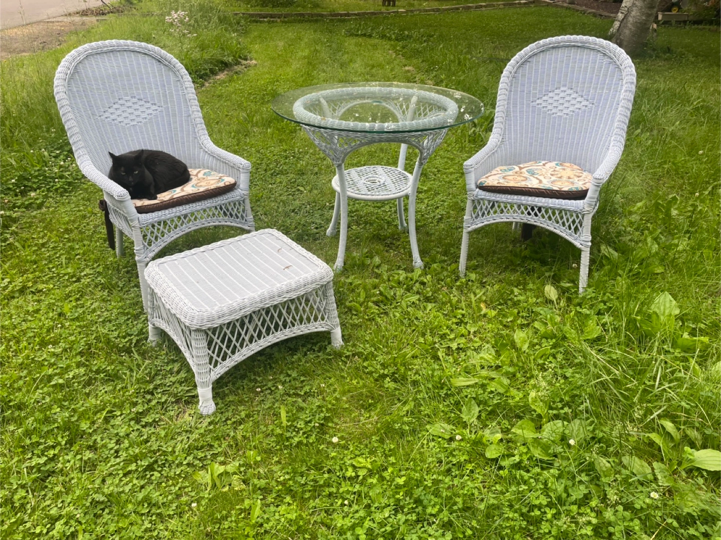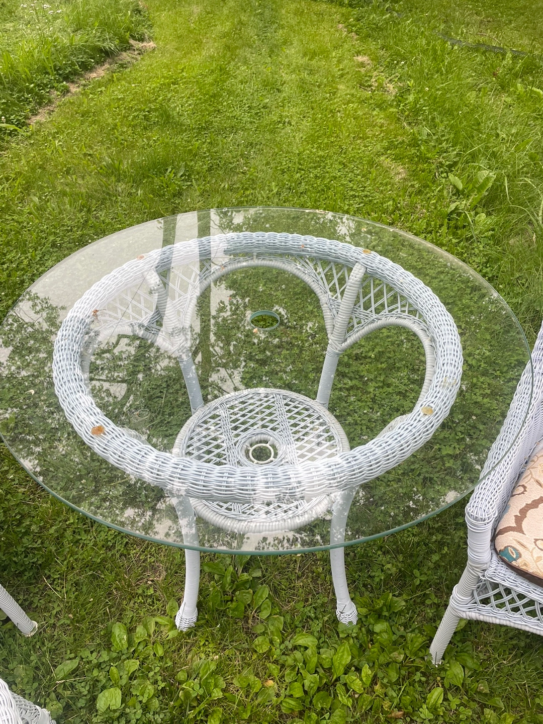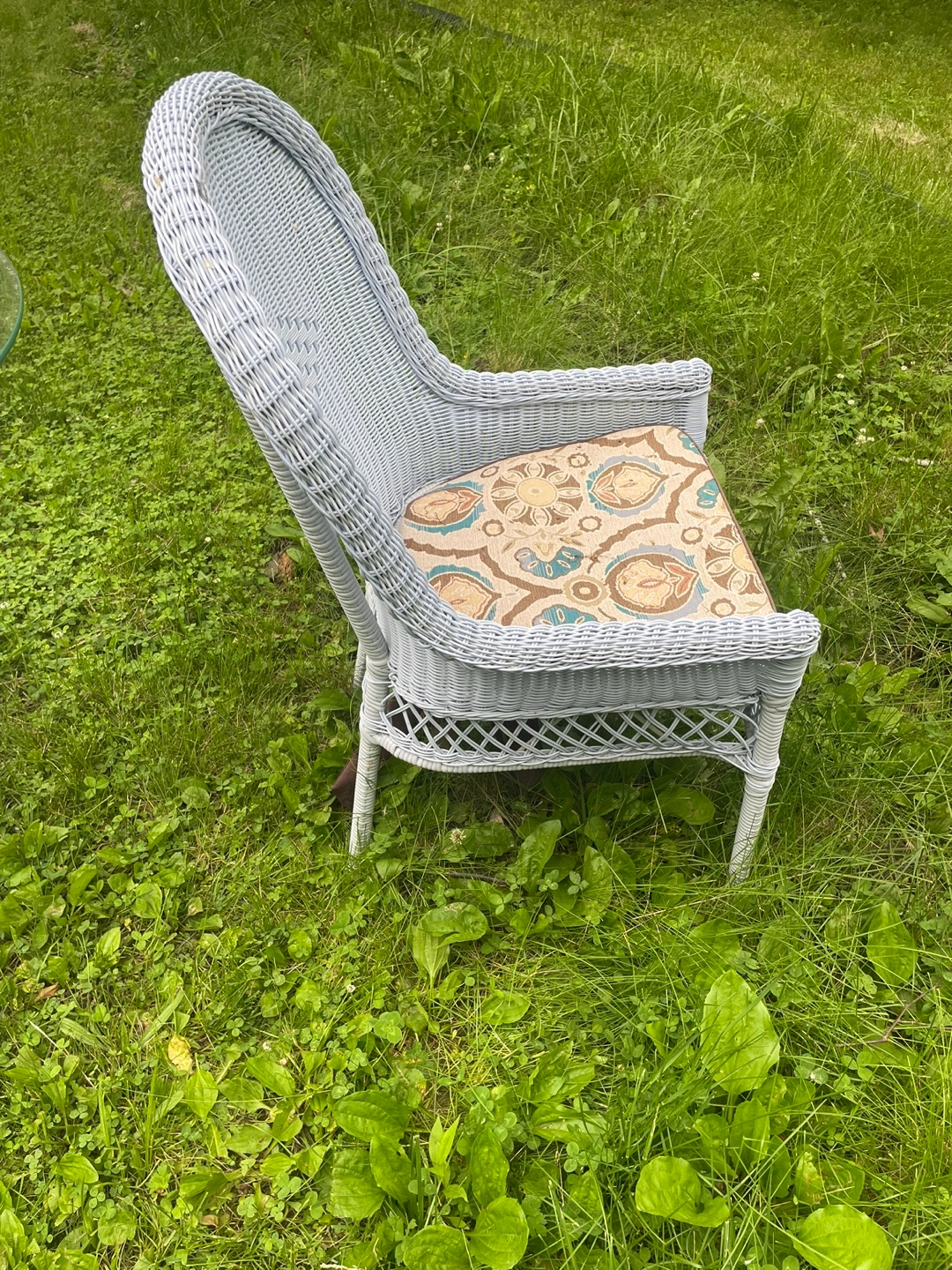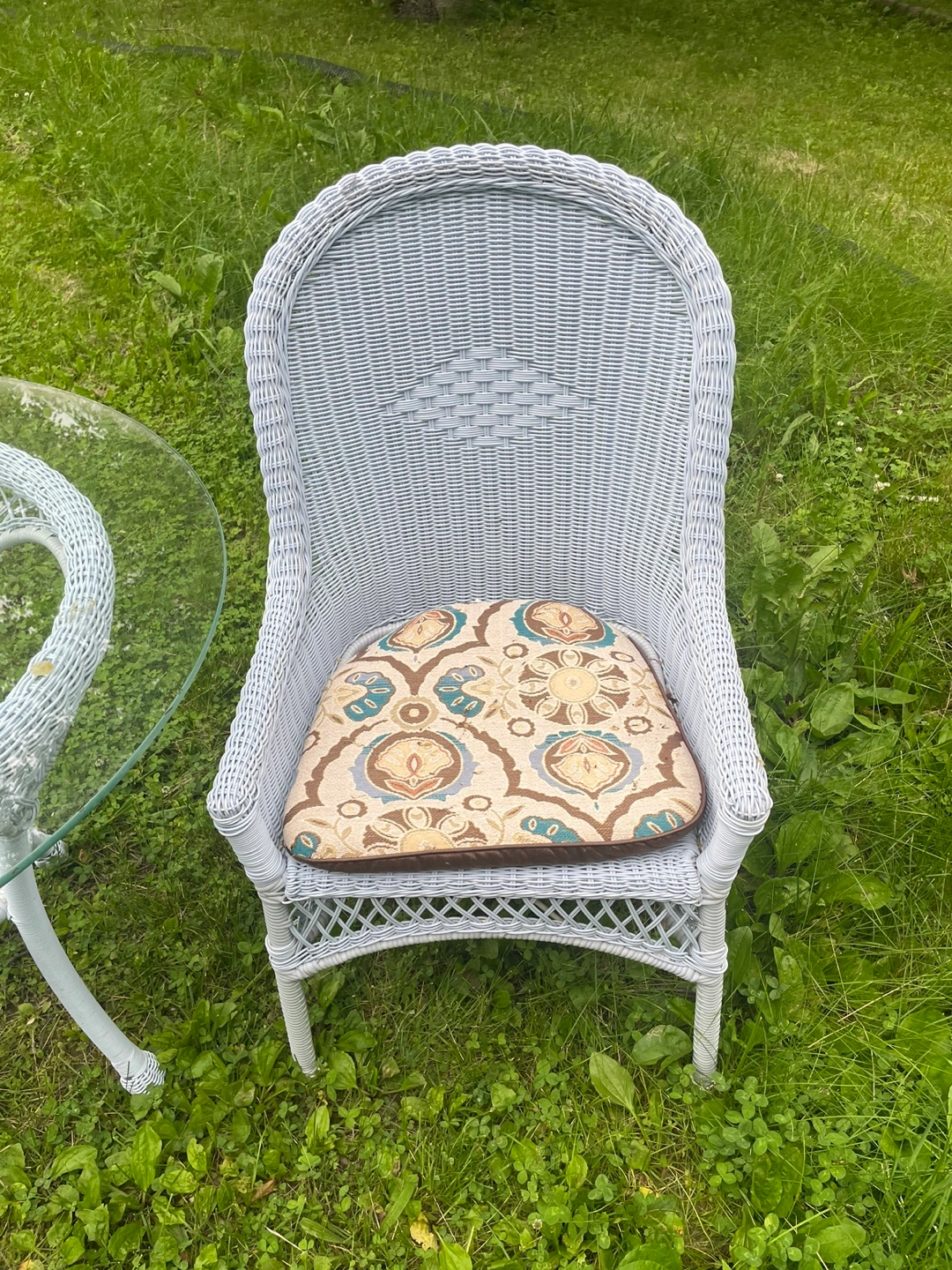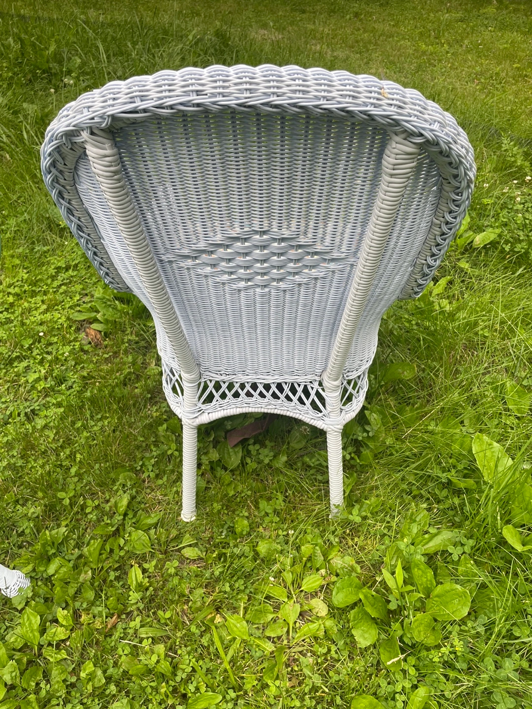 Charming resin wicker chair in a light blue color. Smoke free pet friendly home. Pickup near mall. Perfect for enjoying a peaceful moment outside.