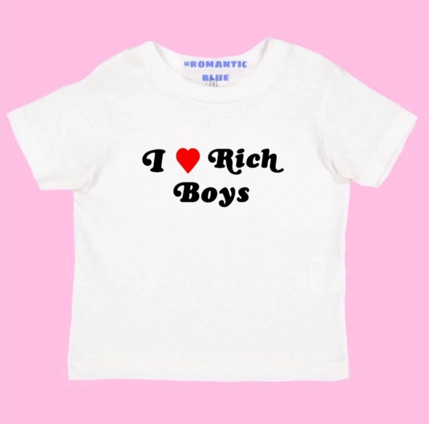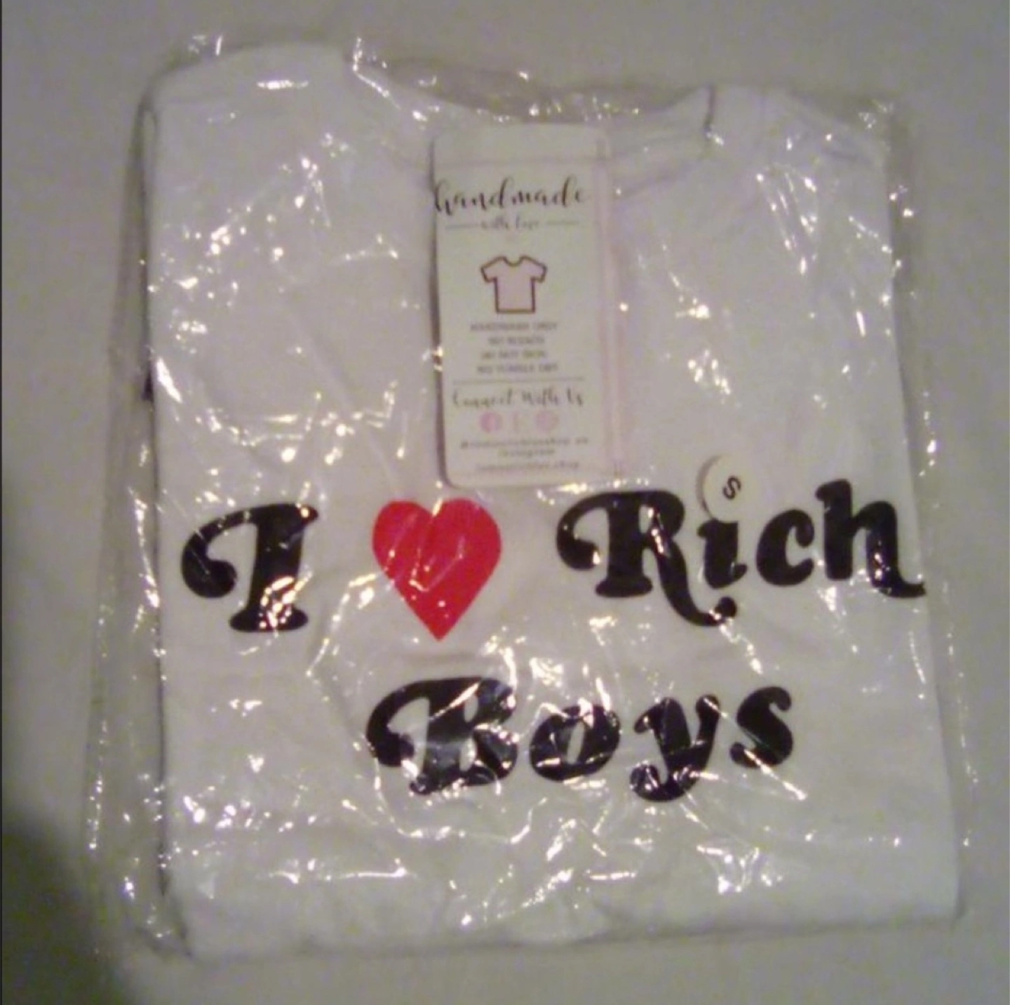 White t-shirt with a print. The print includes the words 'I Love Rich Boys' and a heart. You can dress this up or dress this down. Super cute but I got in a relationship right after I bought it and thought it would be disrespectful to wear it around my bf lol $30 OBO