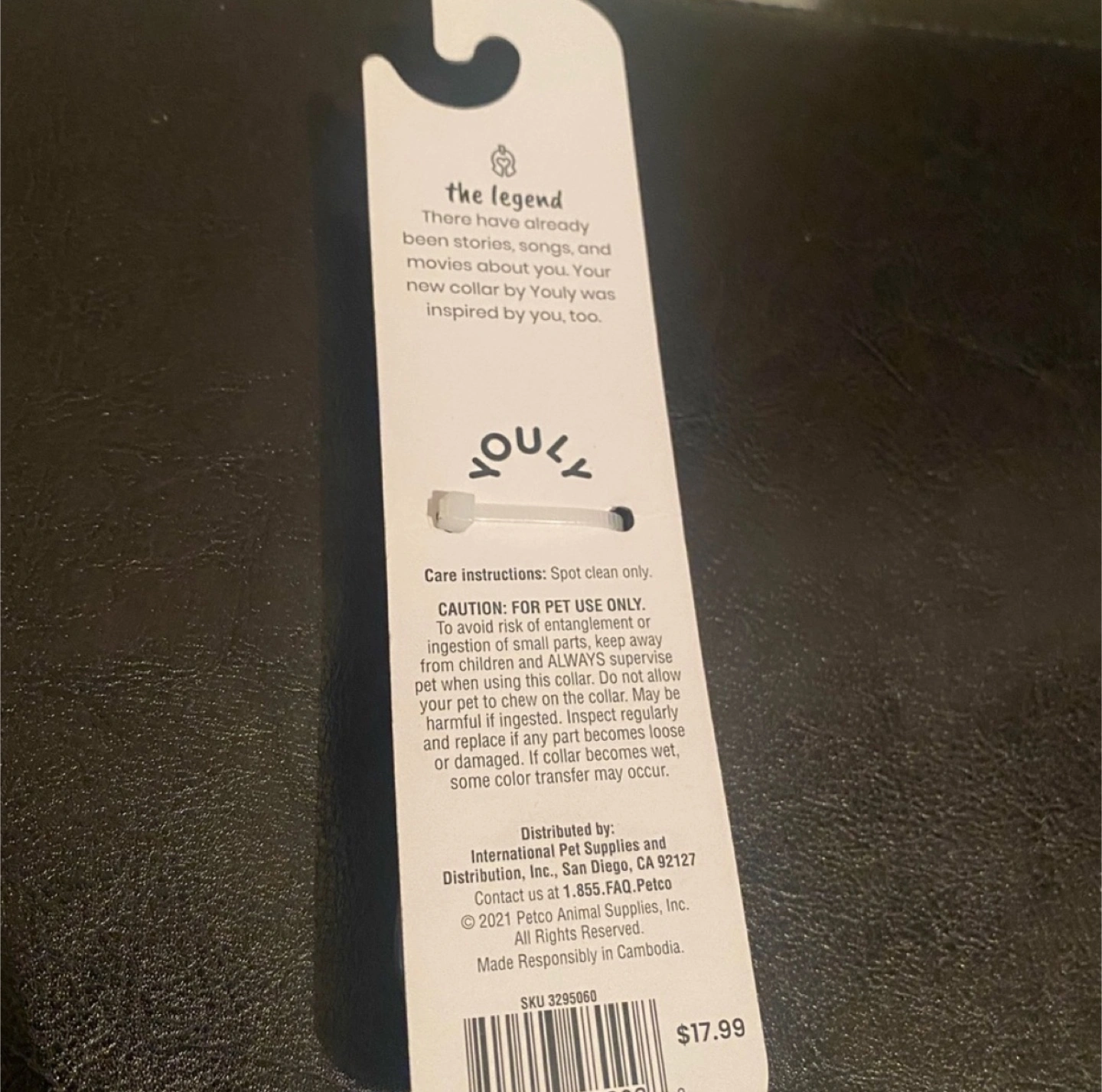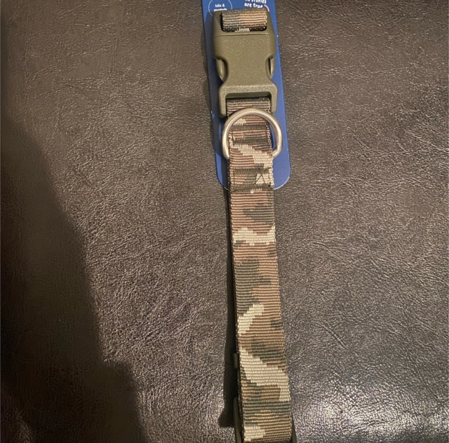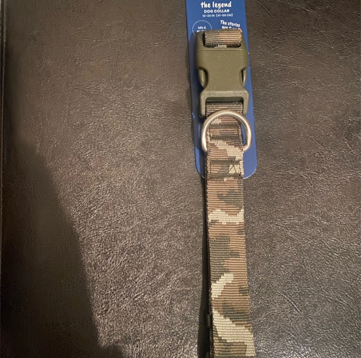 A camo-patterned dog collar. Features a plastic buckle and metal D-ring. Size large 16-26 inch neck size. New with original packaging