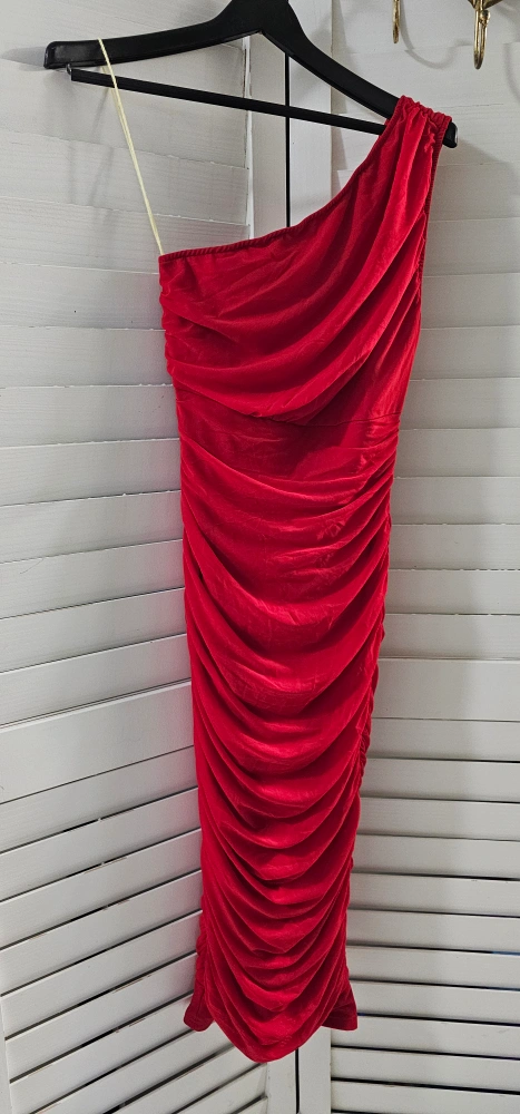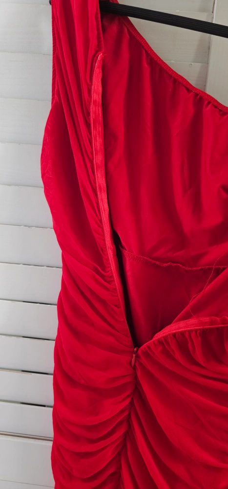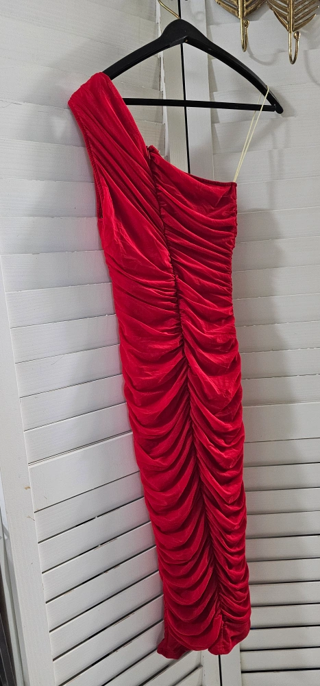 1000+A stunning red dress. Features a one-shoulder design. Has ruching throughout. It will be an excellent choice for a night out or a special occasion.
