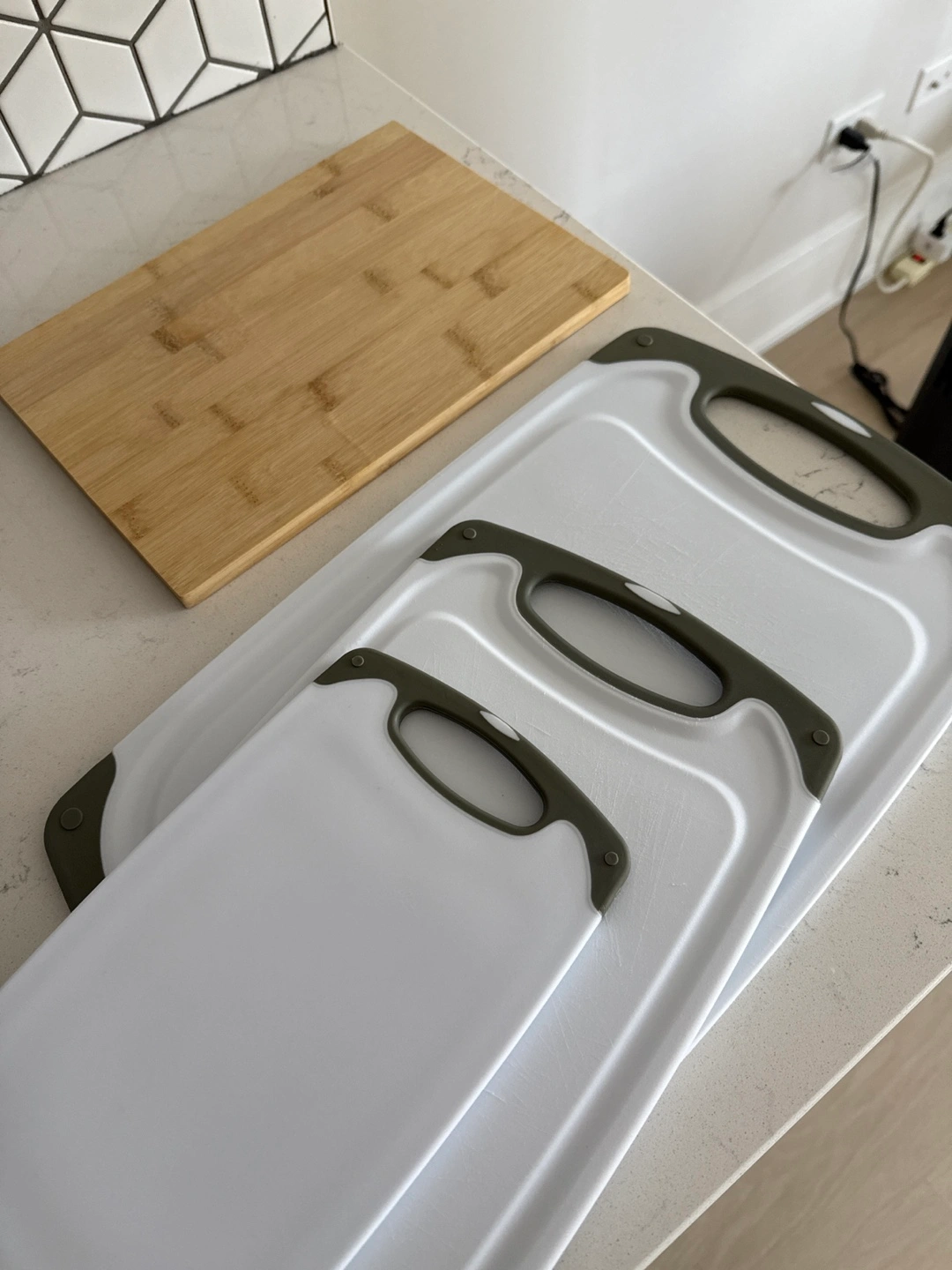 Set includes three white cutting boards with dark handles, and one wood cutting board. They can be used to prepare delicious meals in a calm environment.