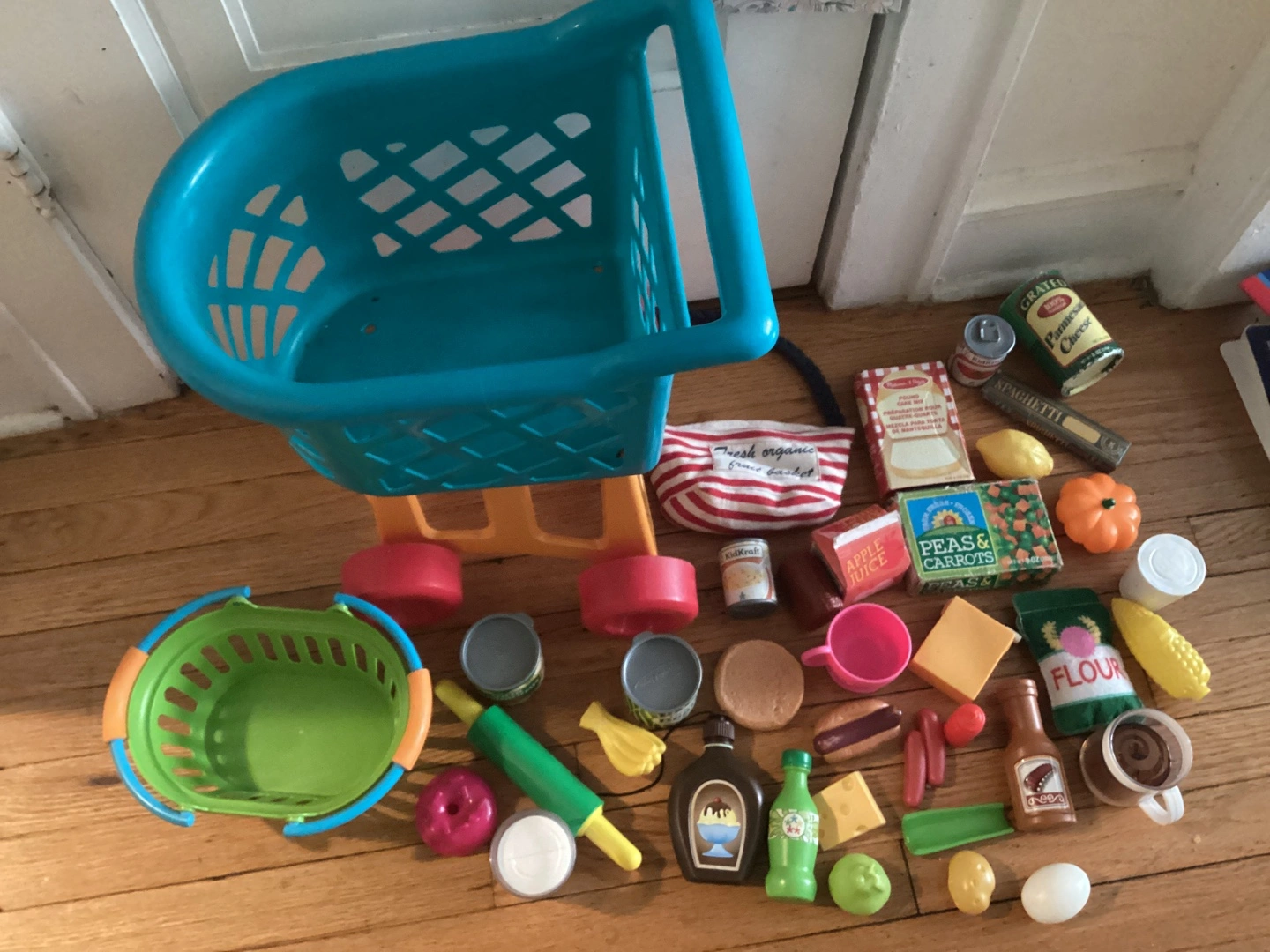 Set of toys includes a shopping cart, groceries, and a carrying basket. A lovely toy set to keep the little ones busy and happy.