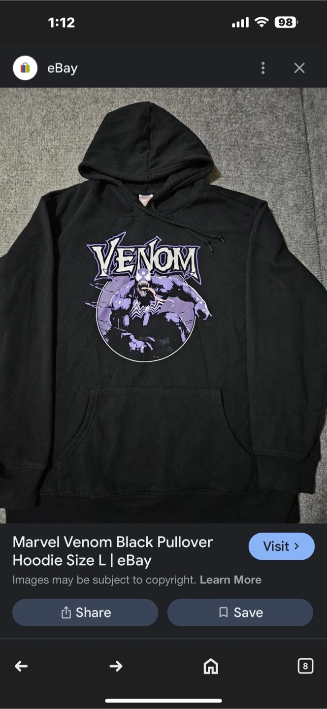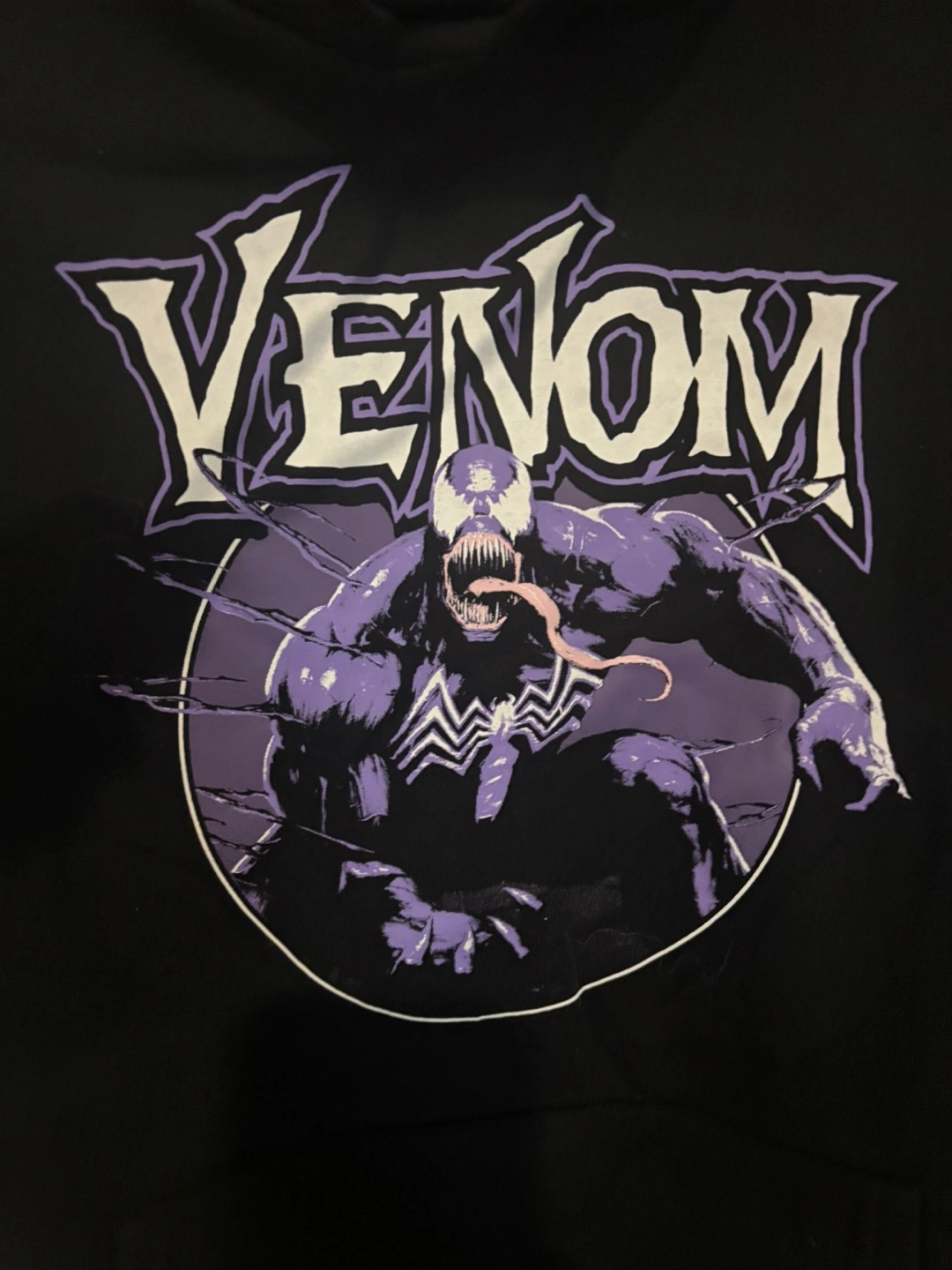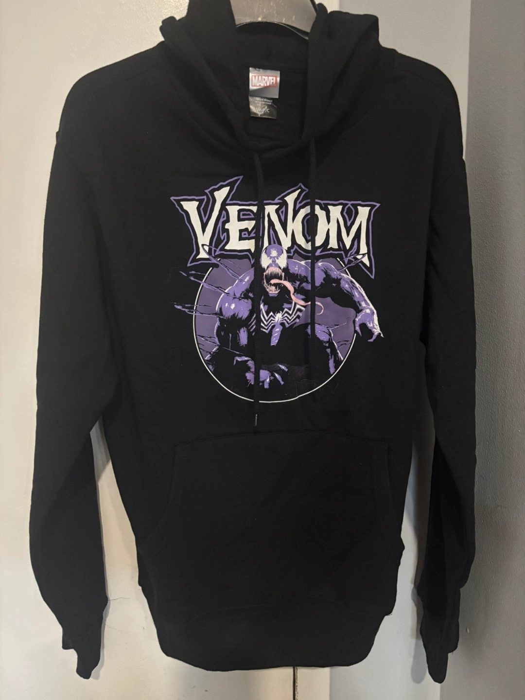 Black in color. Front features the word Venom, along with an image. Has a hood and a front pocket. Consider wearing it on a day you just want to relax and unwind.