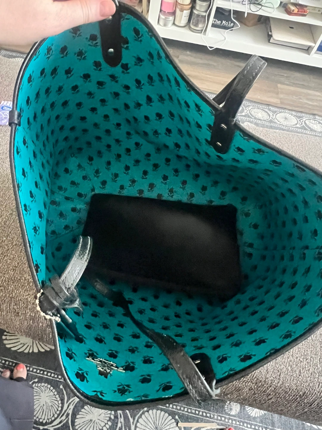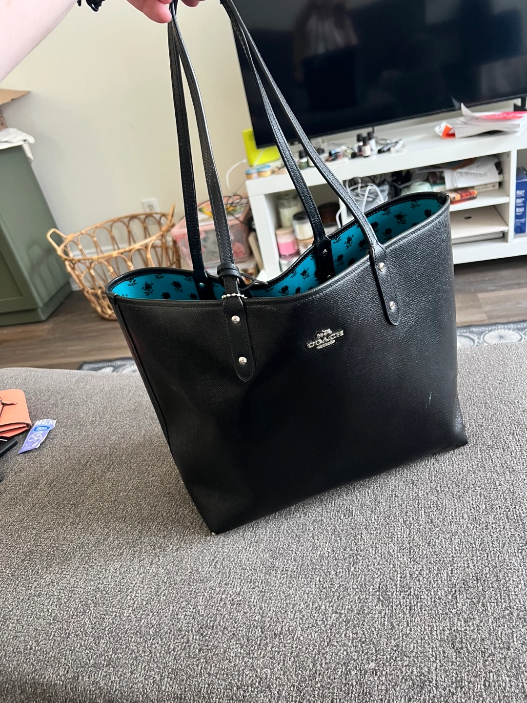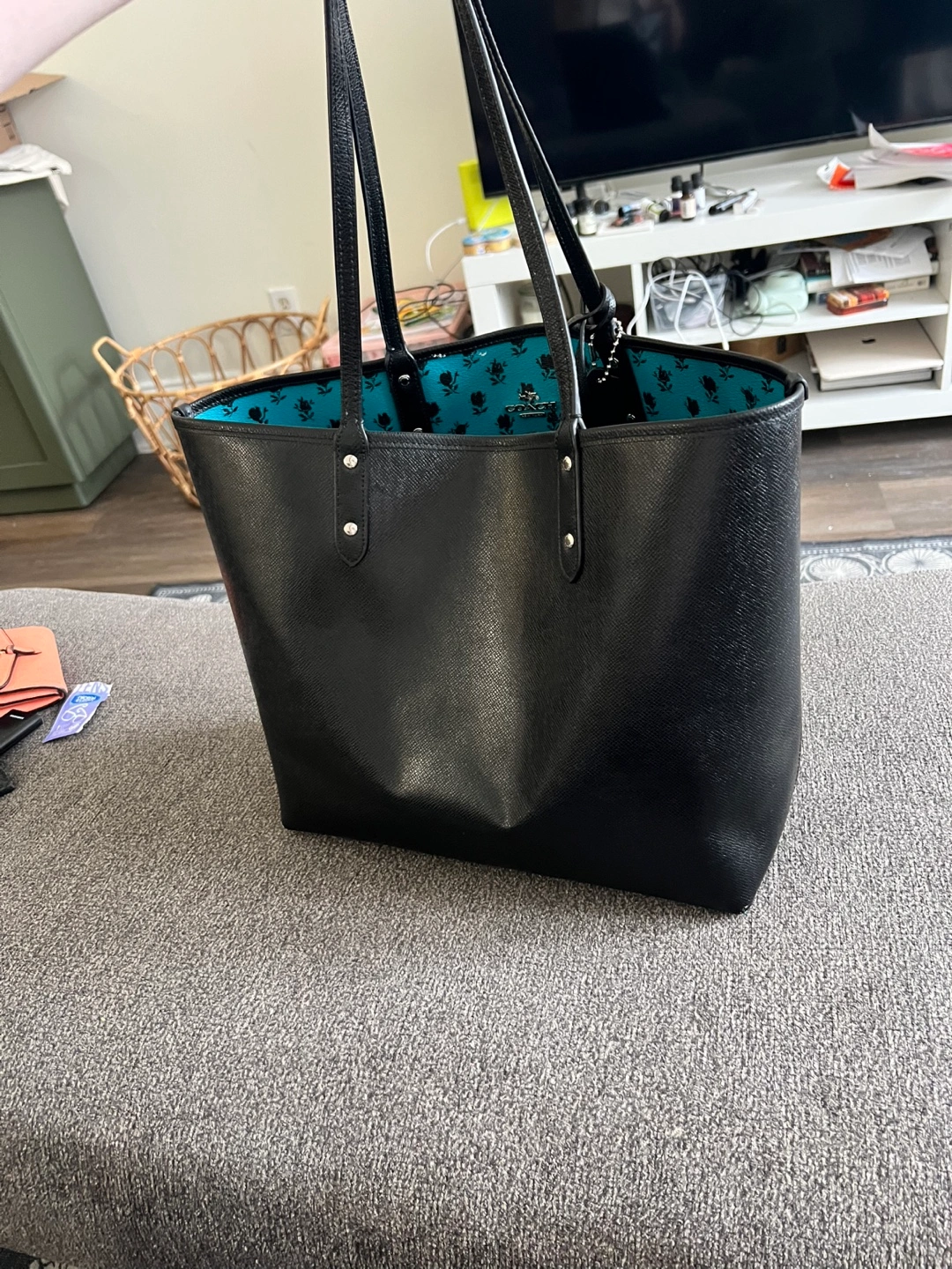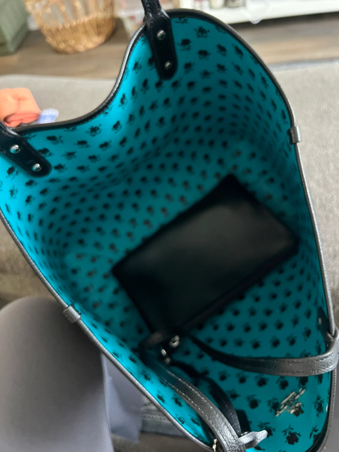 65A beautiful, reversible tote bag, in black, with a bright blue interior. The interior lining features a repeating pattern. The straps are black, as well as the removable pouch inside. This bag is perfect for a relaxing day out.