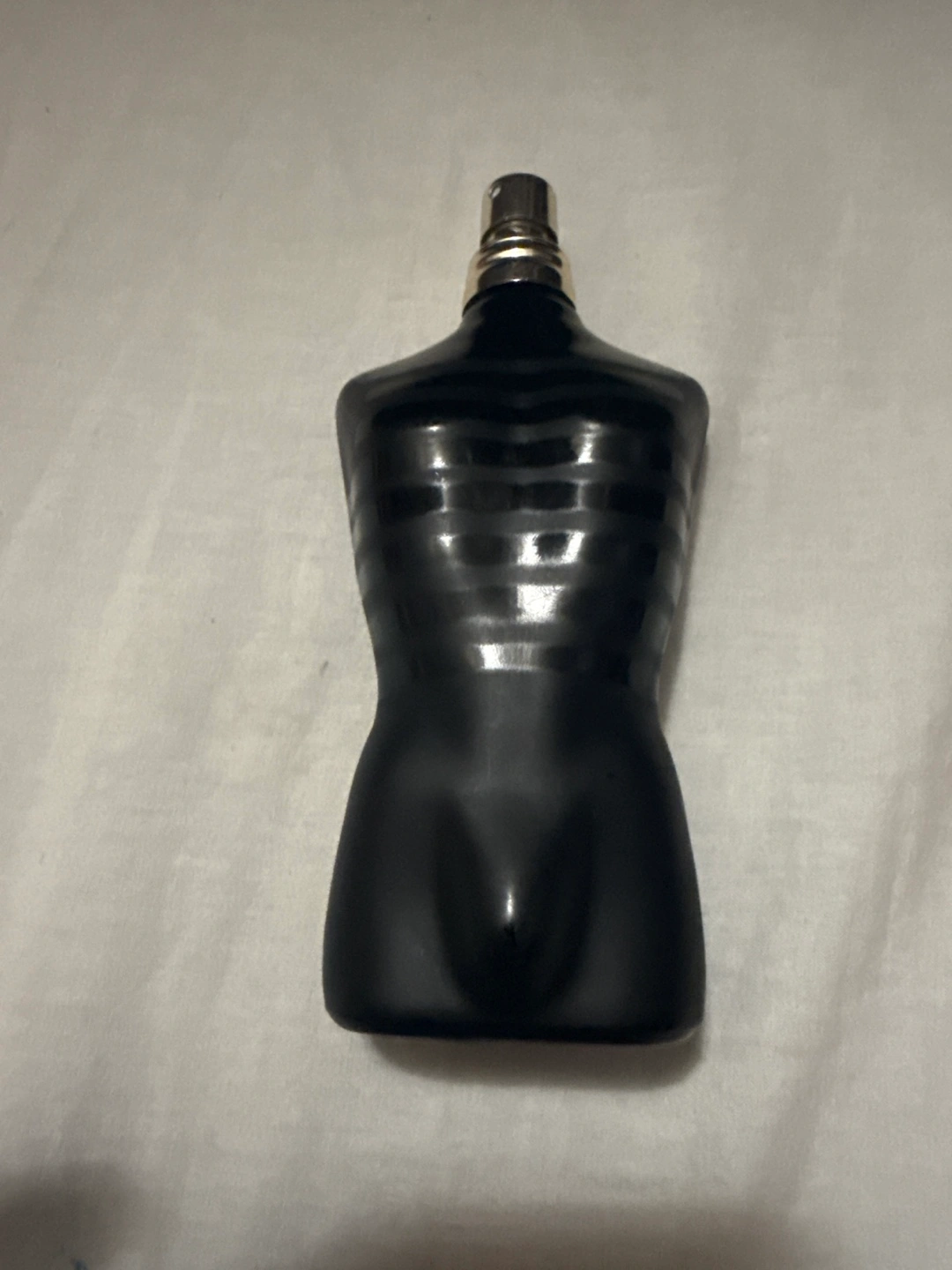 A unique black perfume bottle. Features a torso shape. The bottle appears to have a silver cap. You can use it to hold your favorite scents, or keep it as a decorative item. The bottle is more than half full.