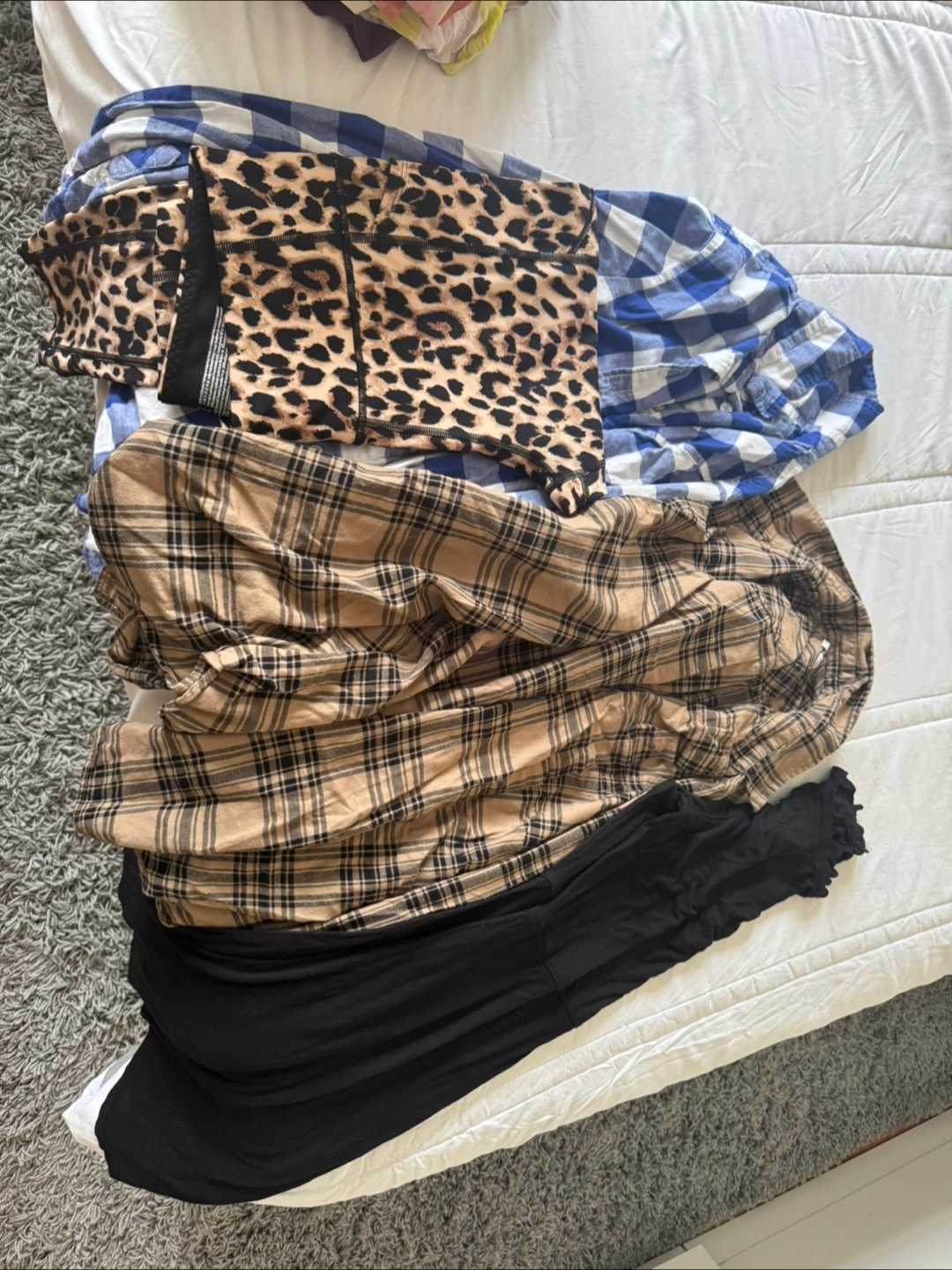 128A bundle of clothes. Includes a blue checkered shirt. A black dress. A flannel. Also, a pair of leopard print leggings. Enjoy some new clothes.