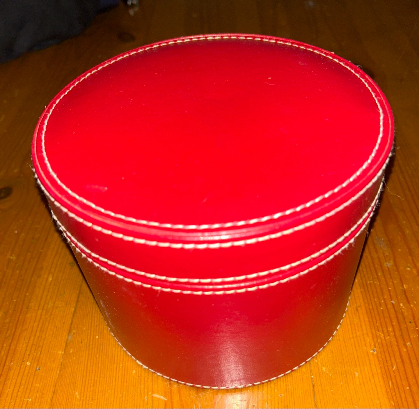 1000+Red round leather box. 6x4”. Great for organizing or storing jewelry or other knickknacks. Like new condition.