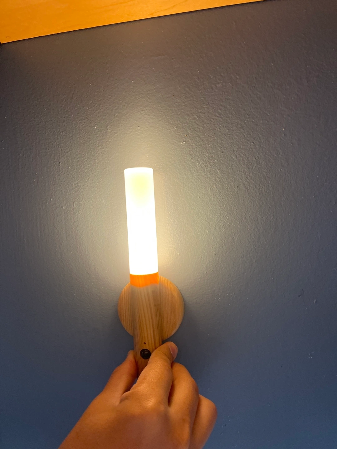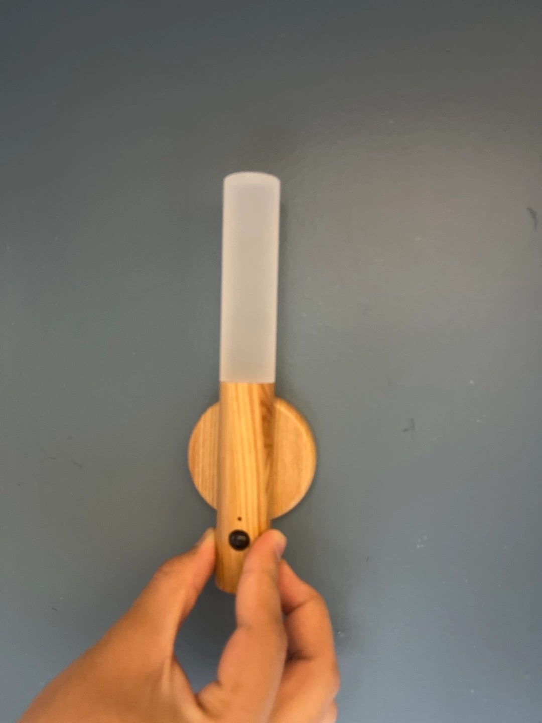 670Features a cylindrical frosted light. Has a wooden base and a circular design. It's a great addition to any space if you want to add a soft glow to it.