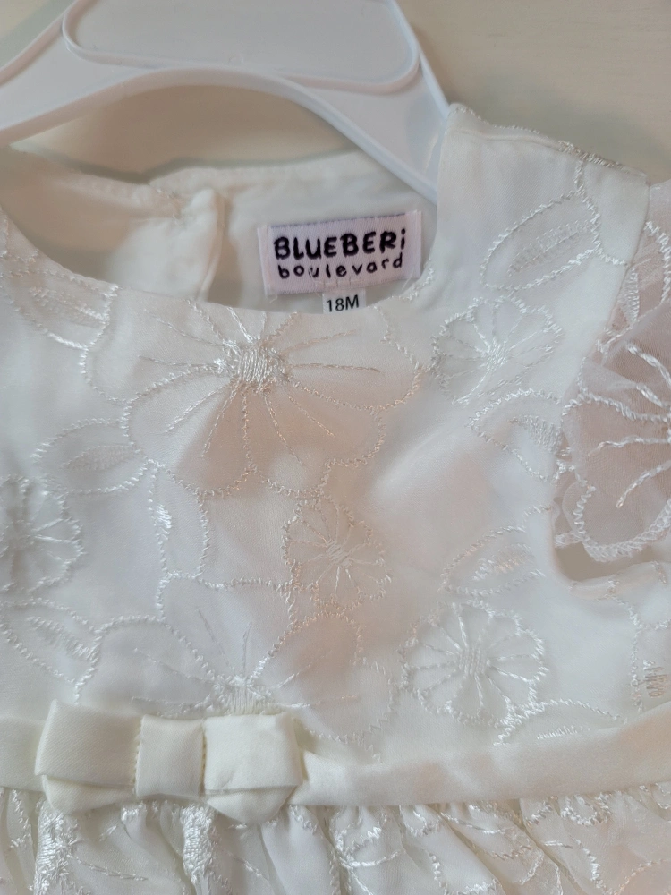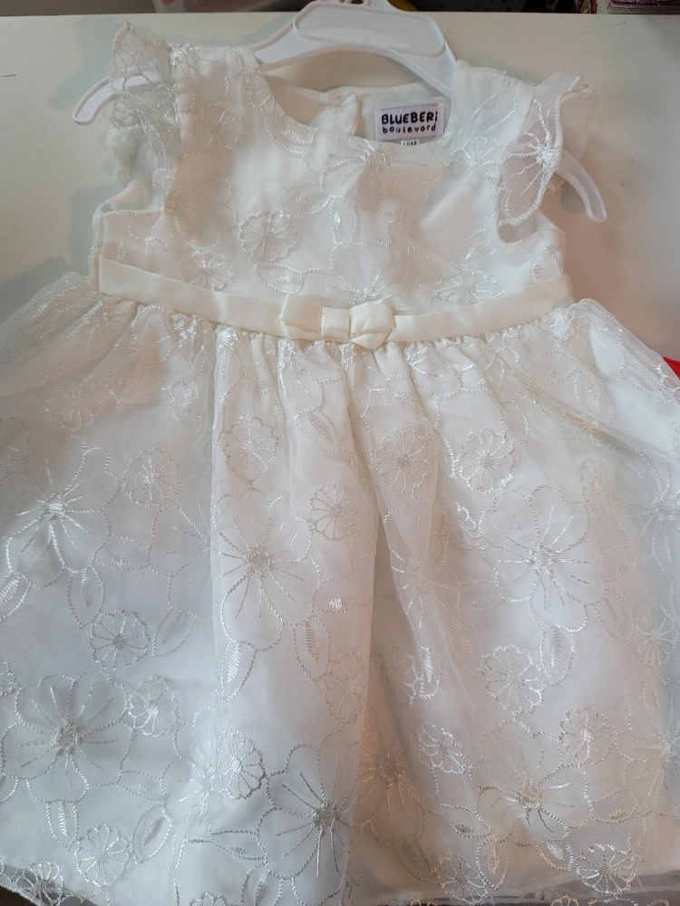 A charming dress, featuring a delicate floral design. It has flutter sleeves and a bow detail at the waist. A great option for a special occasion.