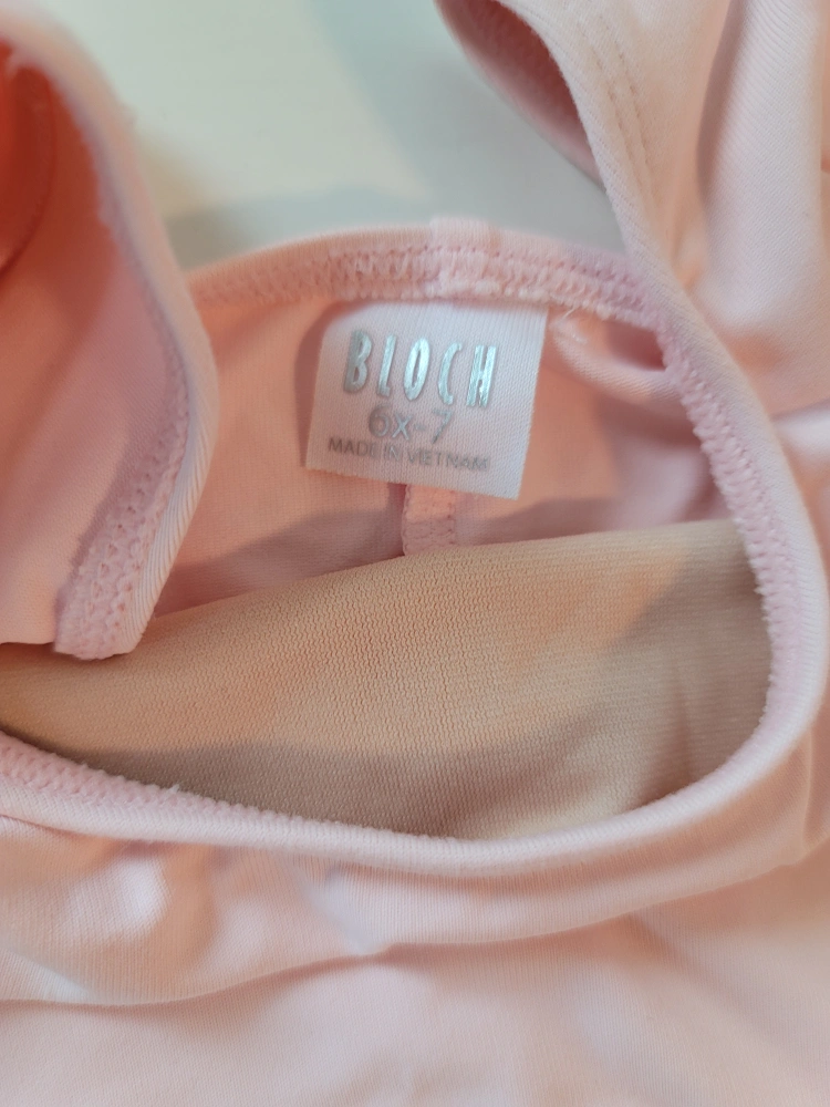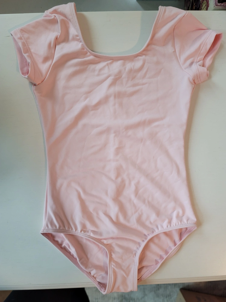 A soft pink ballet leotard. Short sleeves and scoop back design. It can be a joy to watch a performance while wearing this piece.