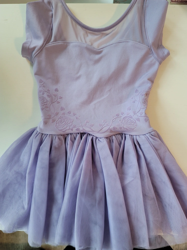 Adorable ballet dress, perfect for dance class. Features a mesh neckline and a tulle skirt. The dress has a floral pattern design on the front. A great piece of clothing for your child to unwind in.