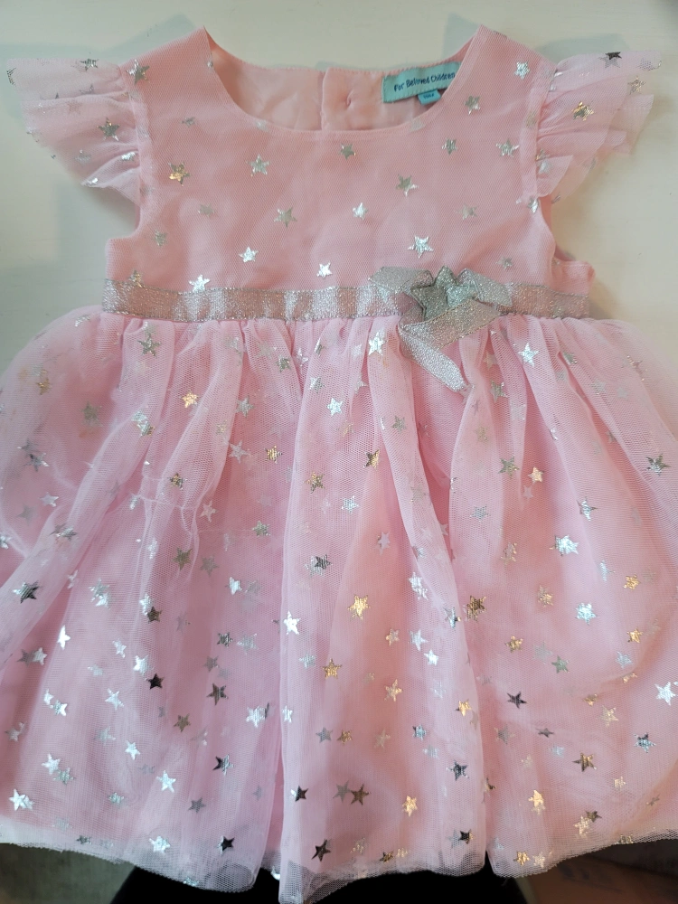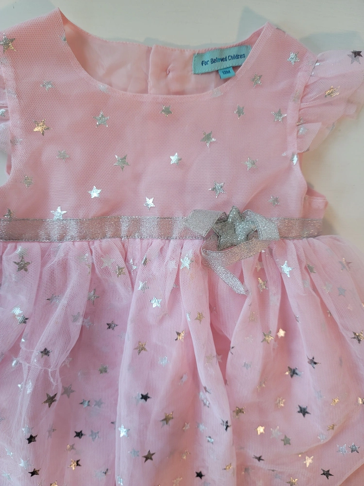 A cute pink dress. Features silver stars. The dress has a ribbon and a bow detail. You can wear this dress to make anyone's day a little bit brighter.