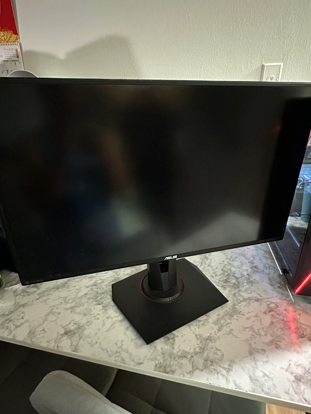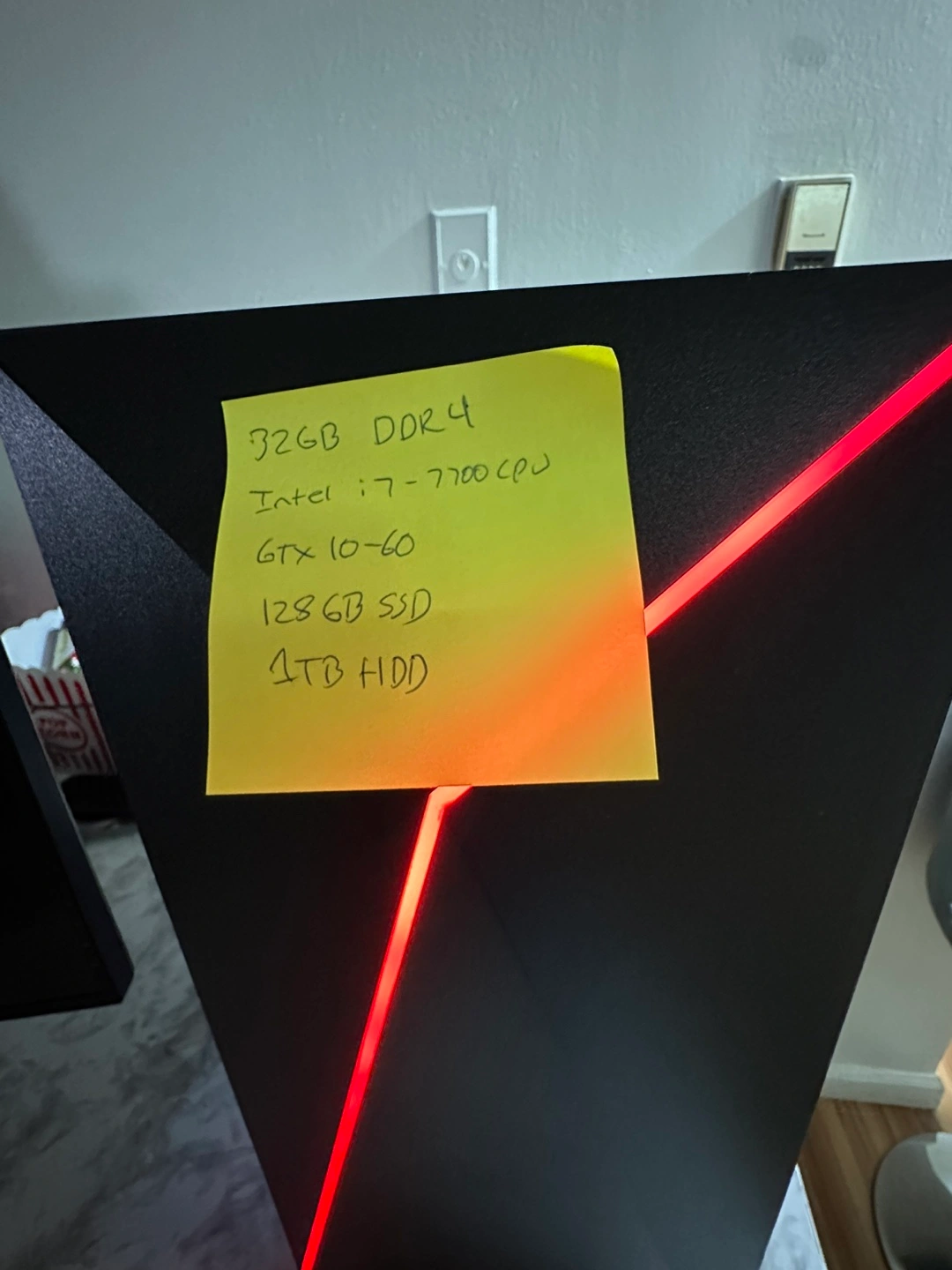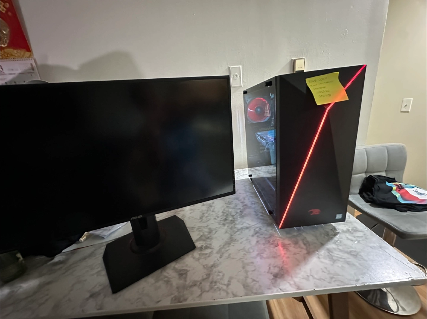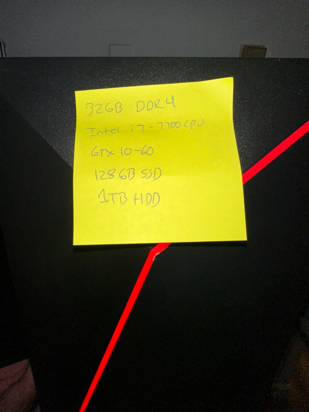 Desktop computer, with the specs listed on the sticky note. Monitor shown in the images. It's a great option for a calm and focused workspace. Asus monitor and pc