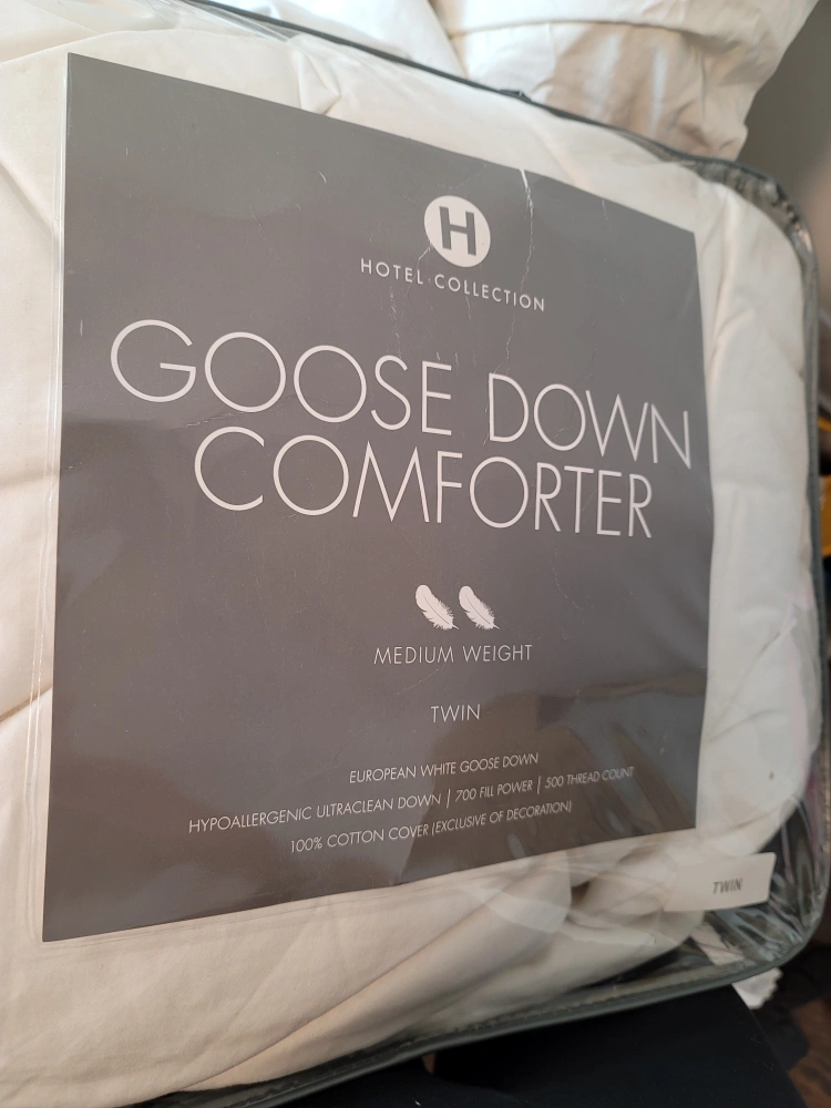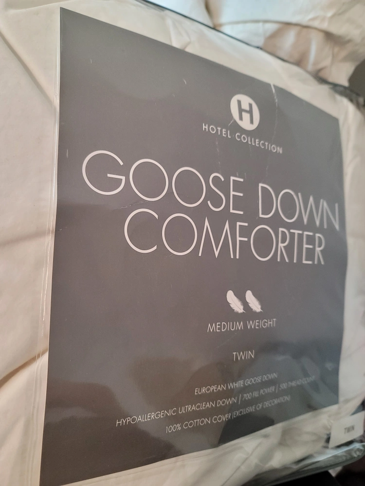 A twin size goose down comforter. It is a medium weight. Made with European white goose down, 700 fill power. The cover is 100% cotton. Such a comfortable item to have for a peaceful night's sleep.