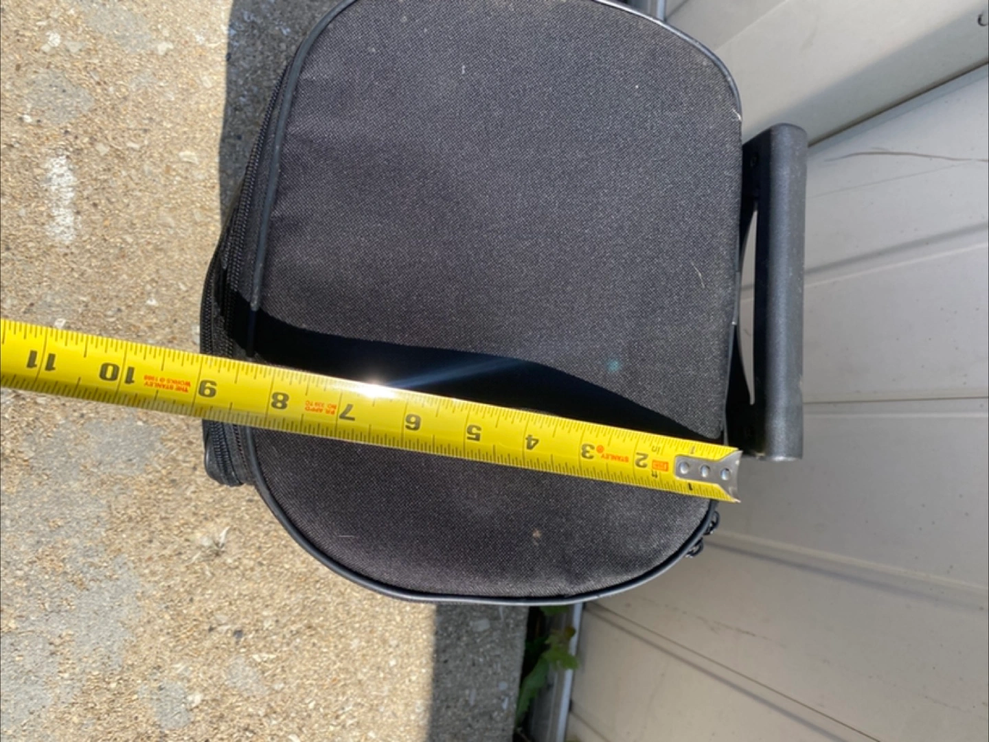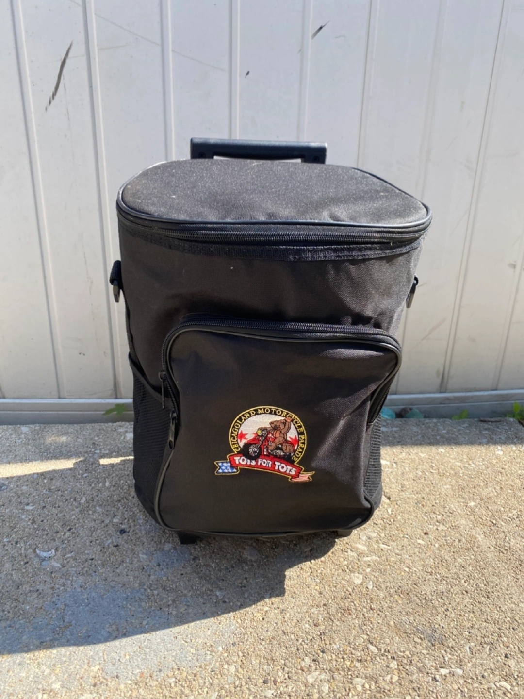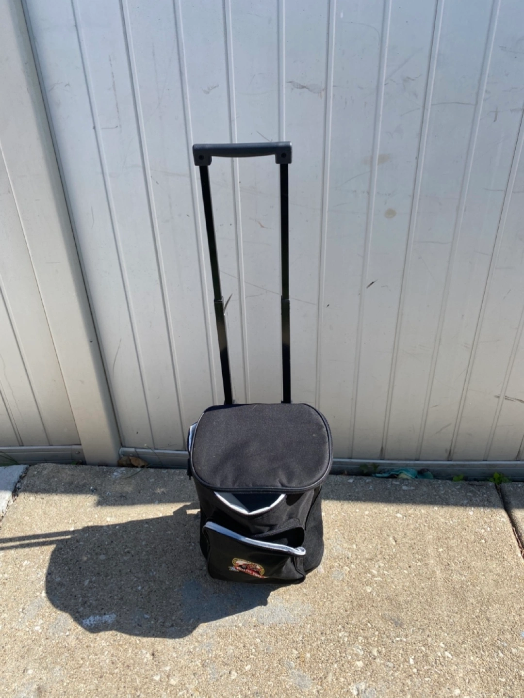 Black fabric bag with wheels, a retractable handle, and a front pocket. Inside, a light-colored insulated interior. A great item to bring along to relax and enjoy a picnic.