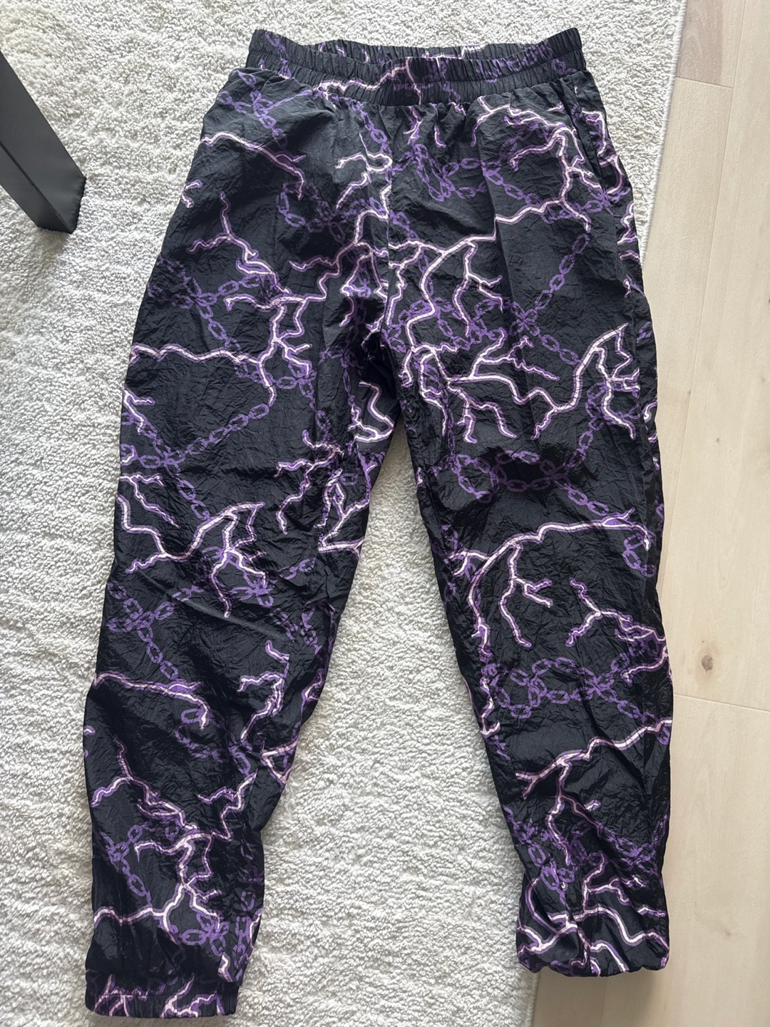 95Black pants with a unique lightning bolt pattern. Features an elastic waistband. Perfect for a relaxing day. #thirftypick 🥕