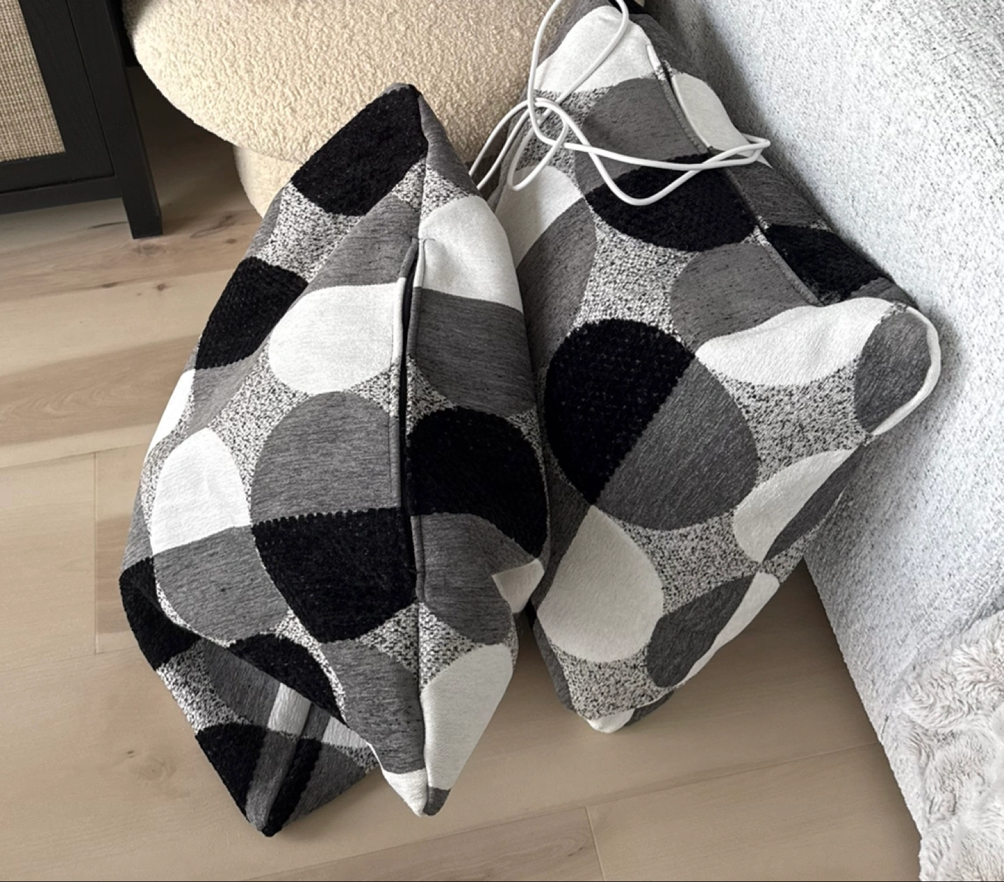 95Never used. Came with couch but didn’t like the pattern. Pillows with a striking circular pattern. A neutral color palette. They could be placed on your bed for a cozy feel. 🥕