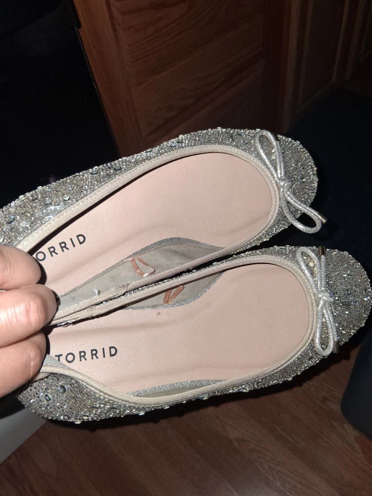 These beautiful shoes will make you feel special. The inside has the brand's logo. They have embellishments covering the front and the sides. These would look nice with a nice dress for a calm evening.